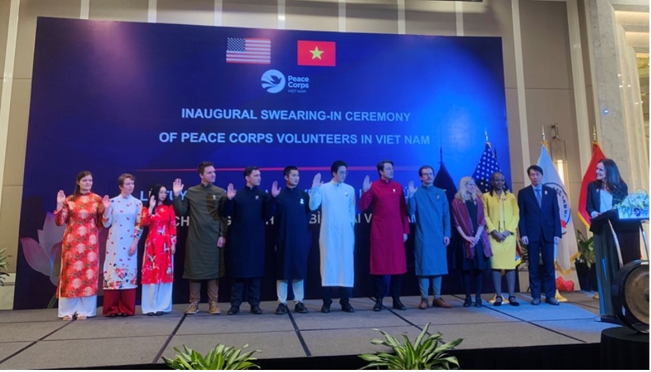 Các tình nguyện viên của Chương trình Hòa bình tại Việt Nam thực hiện nghi thức tuyên thệ để bắt đầu tham gia giảng dạy tiếng Anh trong hai năm ở Việt Nam, ngày 30/12/2022. (Ảnh: Báo điện tử Đảng Cộng Sản Việt Nam)