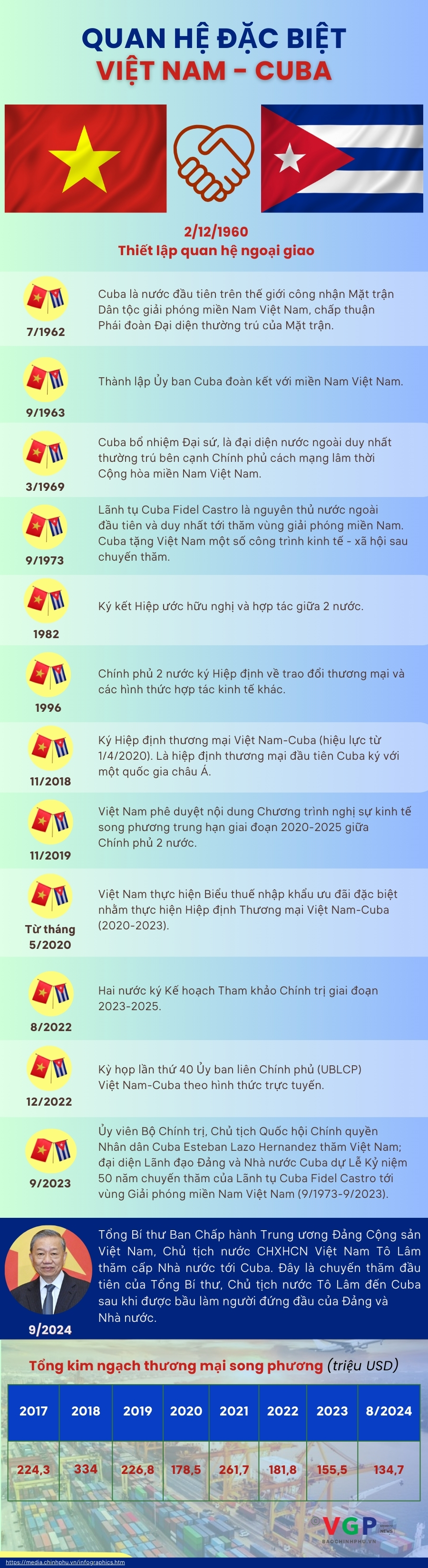 Tháng 9/2024, Tổng Bí thư Ban Chấp hành Trung ương Đảng Cộng sản Việt Nam, Chủ tịch nước Cộng hòa xã hội chủ nghĩa Việt Nam Tô Lâm và Phu nhân cùng đoàn đại biểu cấp cao Việt Nam thăm cấp Nhà nước tới Cuba theo lời mời của Bí thư thứ nhất Ban Chấp hành Trung ương Đảng Cộng sản Cuba, Chủ tịch nước Cộng hòa Cuba Miguel Diaz Canel Bermudez cùng Phu nhân.