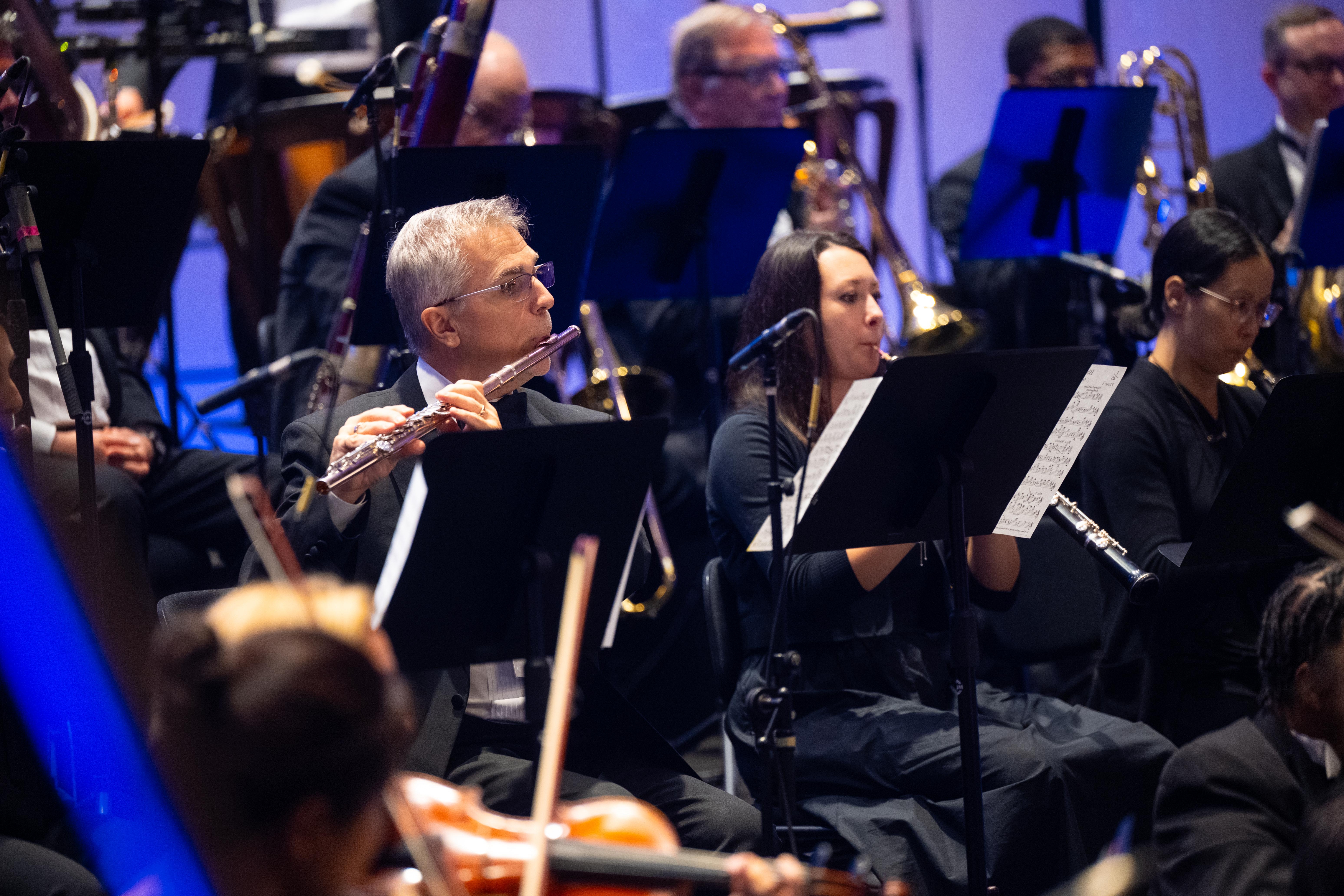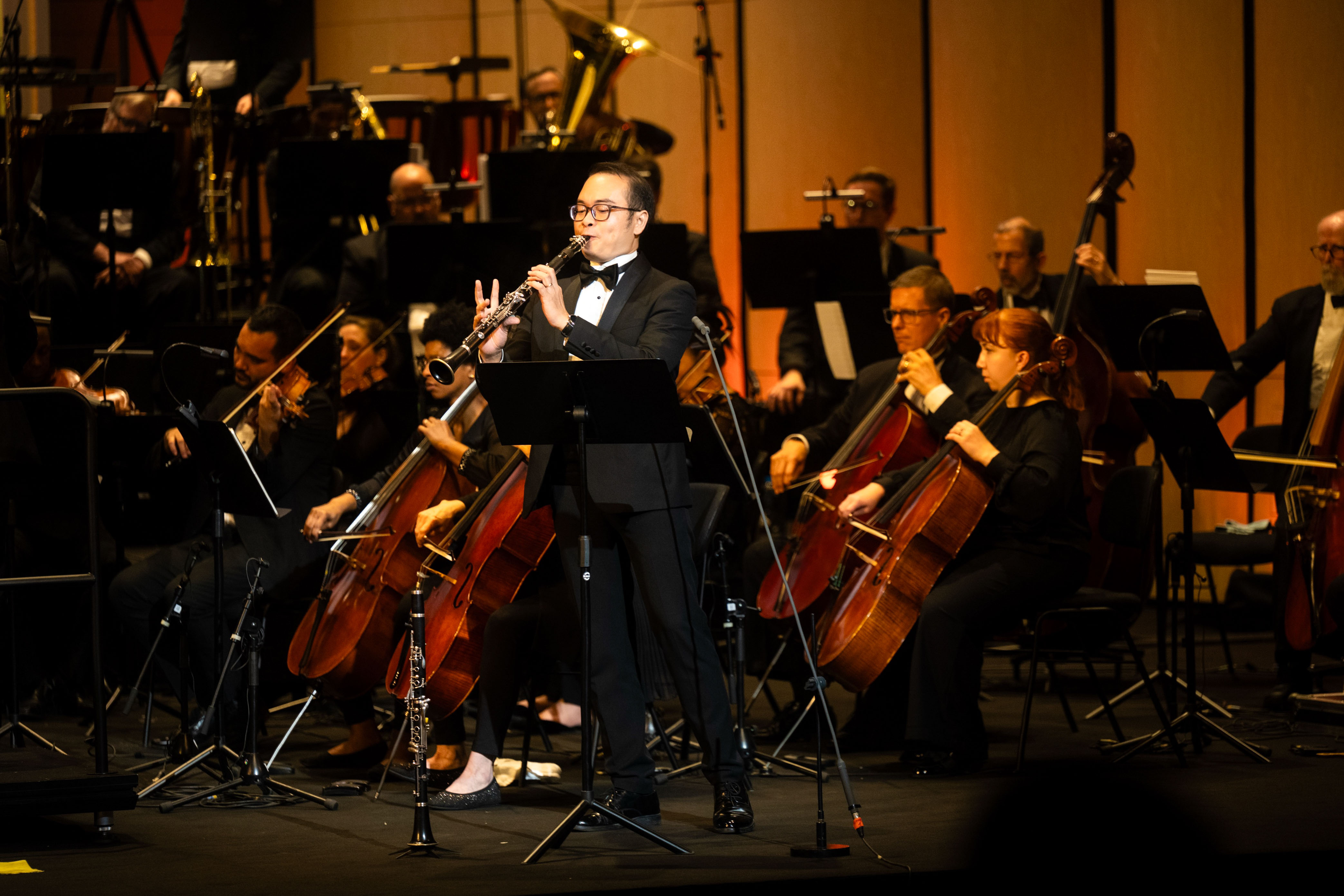 Nghệ sĩ clarinet Trần Khánh Quang hòa vào dàn nhạc bằng tiếng clarinet mềm mại và sâu lắng, như lời thì thầm ân cần giữa những bản giao hưởng tráng lệ.