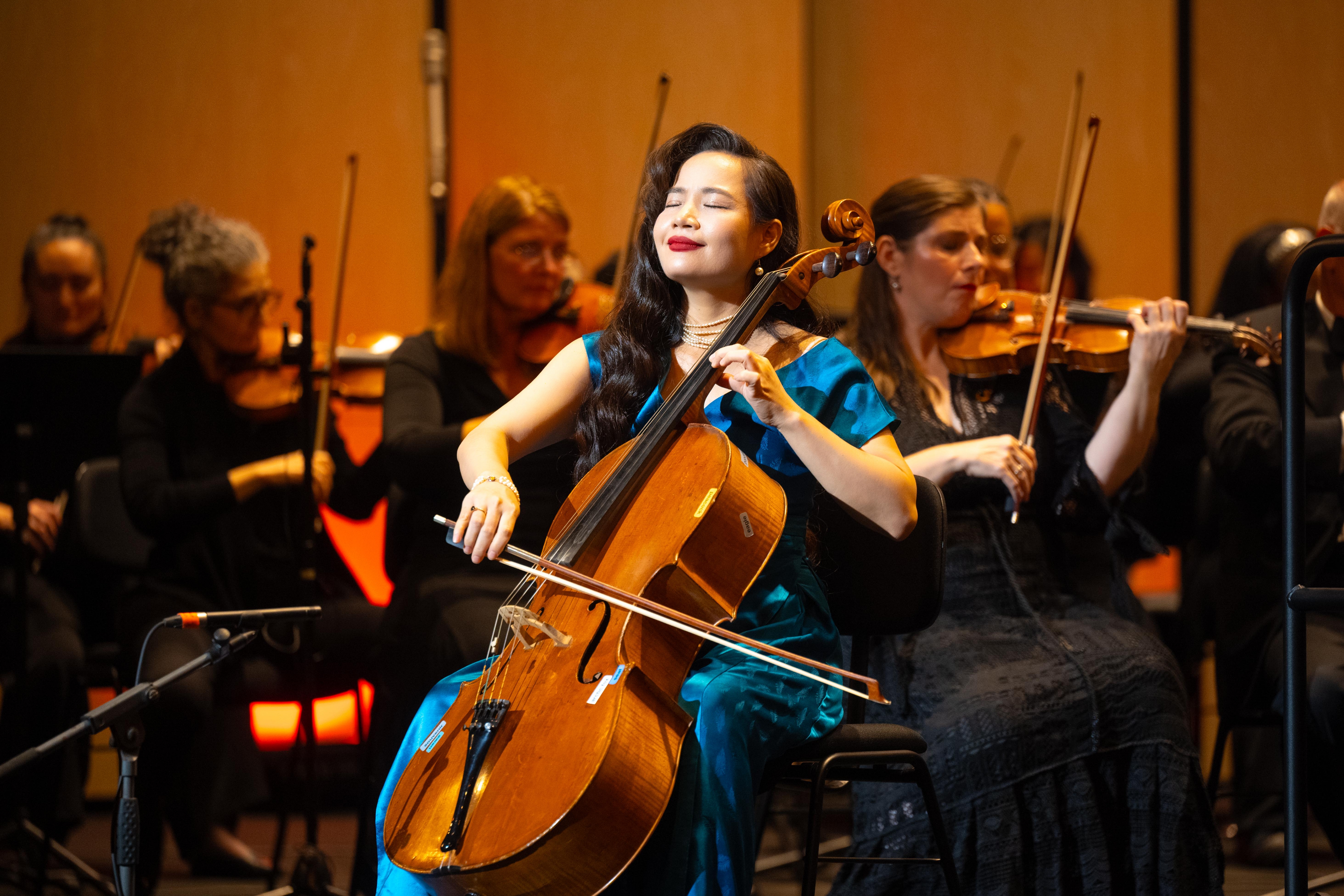 Nghệ sĩ cello cố vấn nghệ thuật Đinh Hoài Xuân say sưa hòa mình trong nhịp chậm của bản nhạc