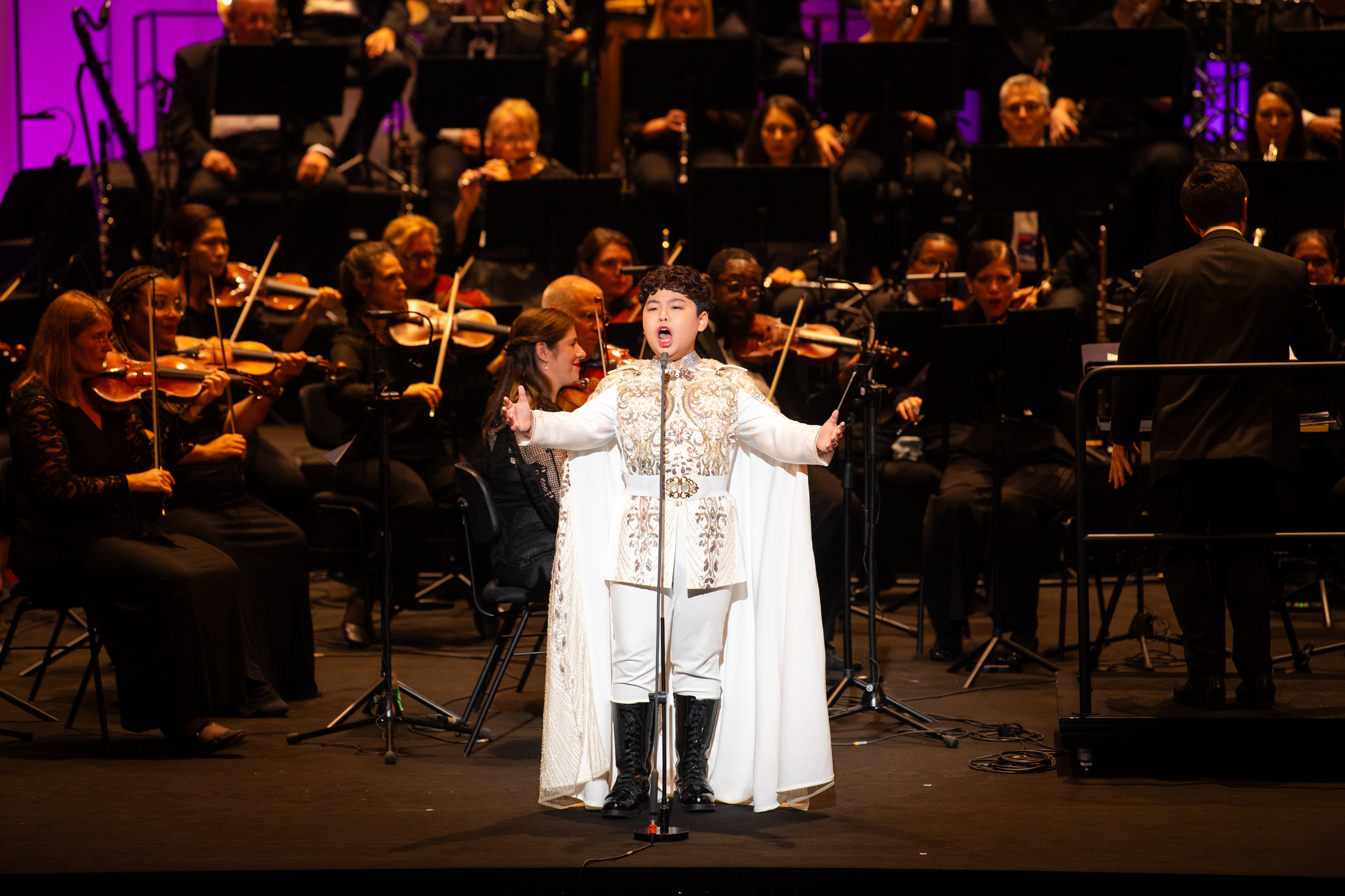 “Thần đồng opera” Dương Đức Hải, mới 13 tuổi, khiến khán phòng xúc động khi cất giọng trong trẻo, trong một tiết mục đậm tính giao hòa Đông –-Tây.