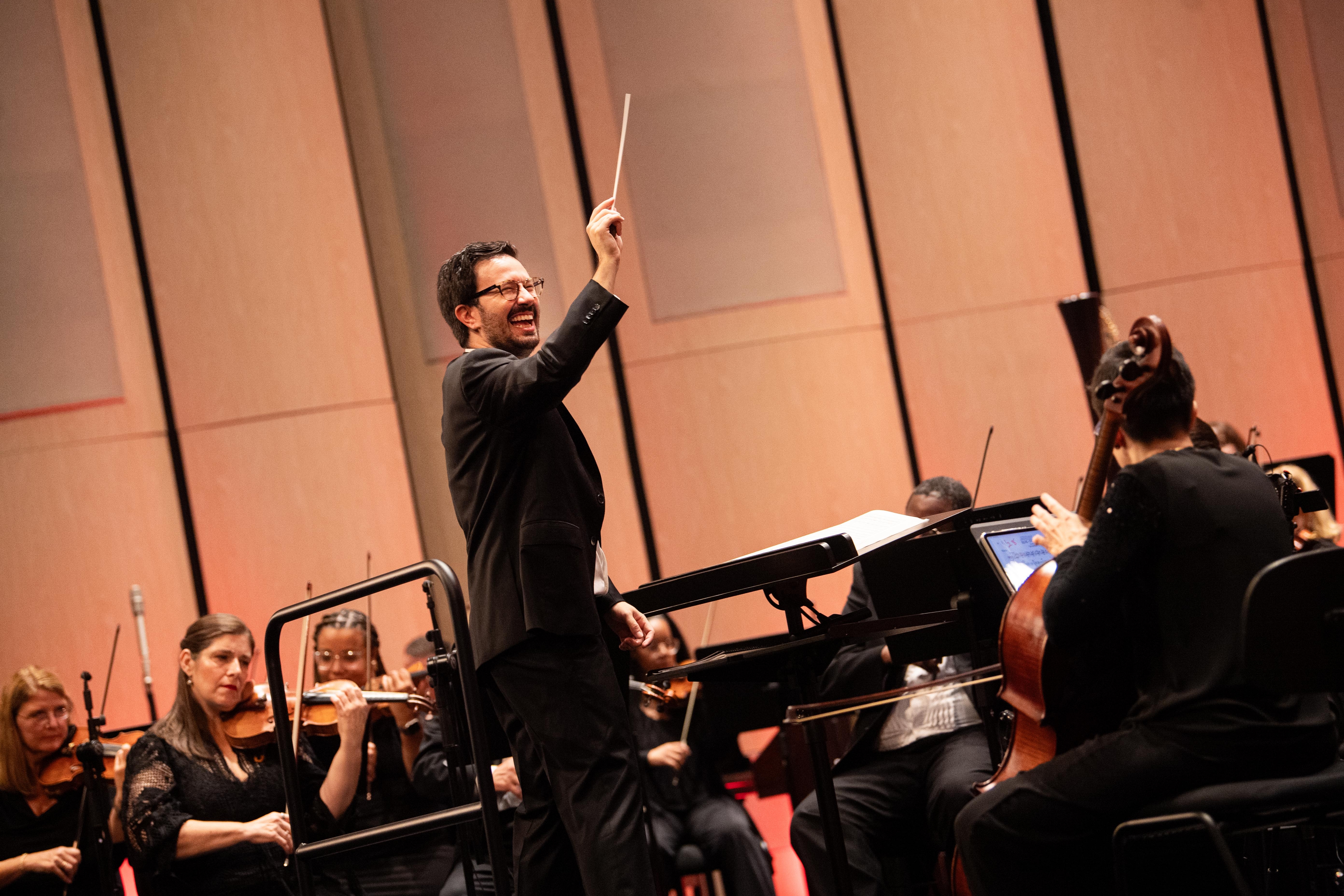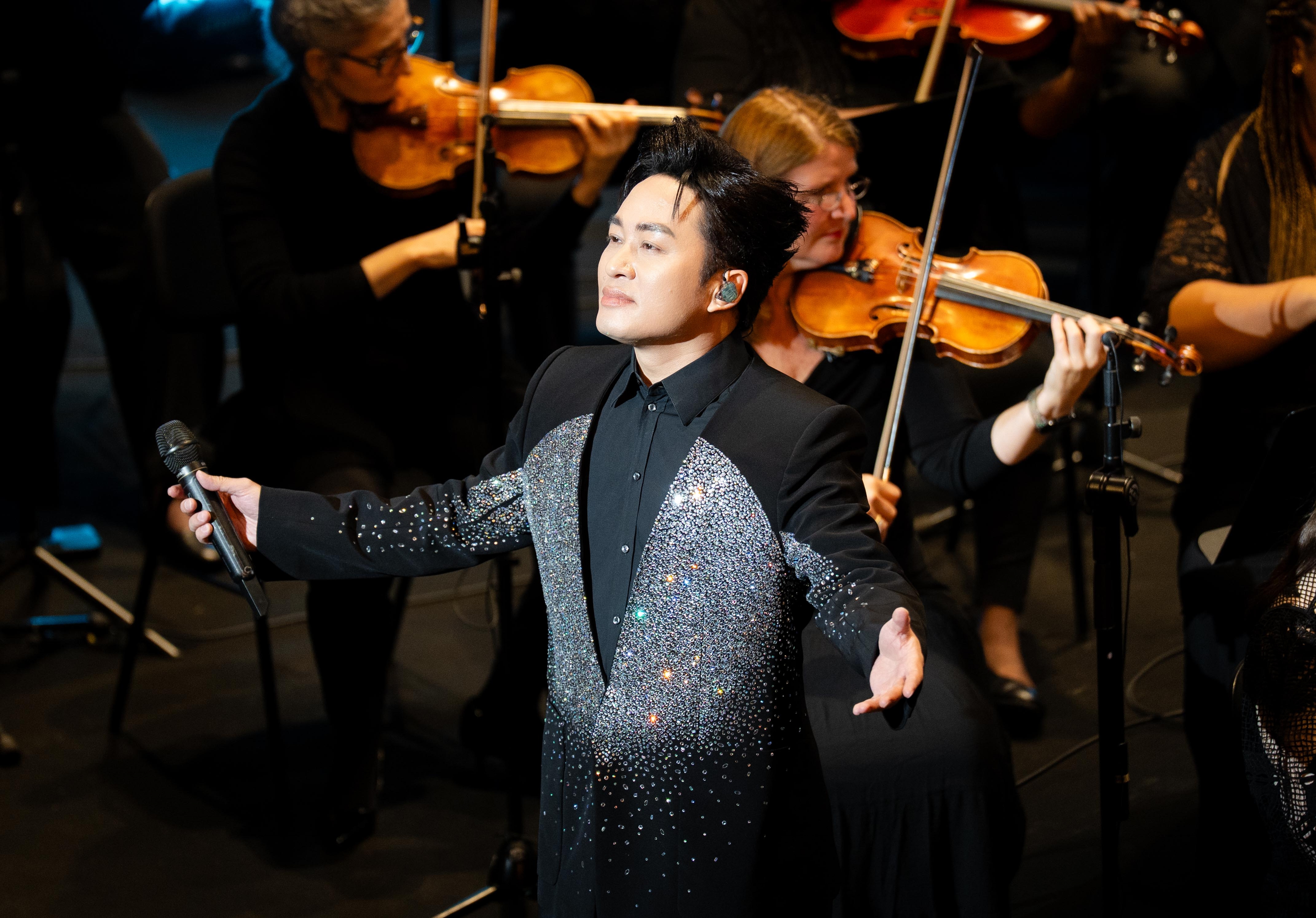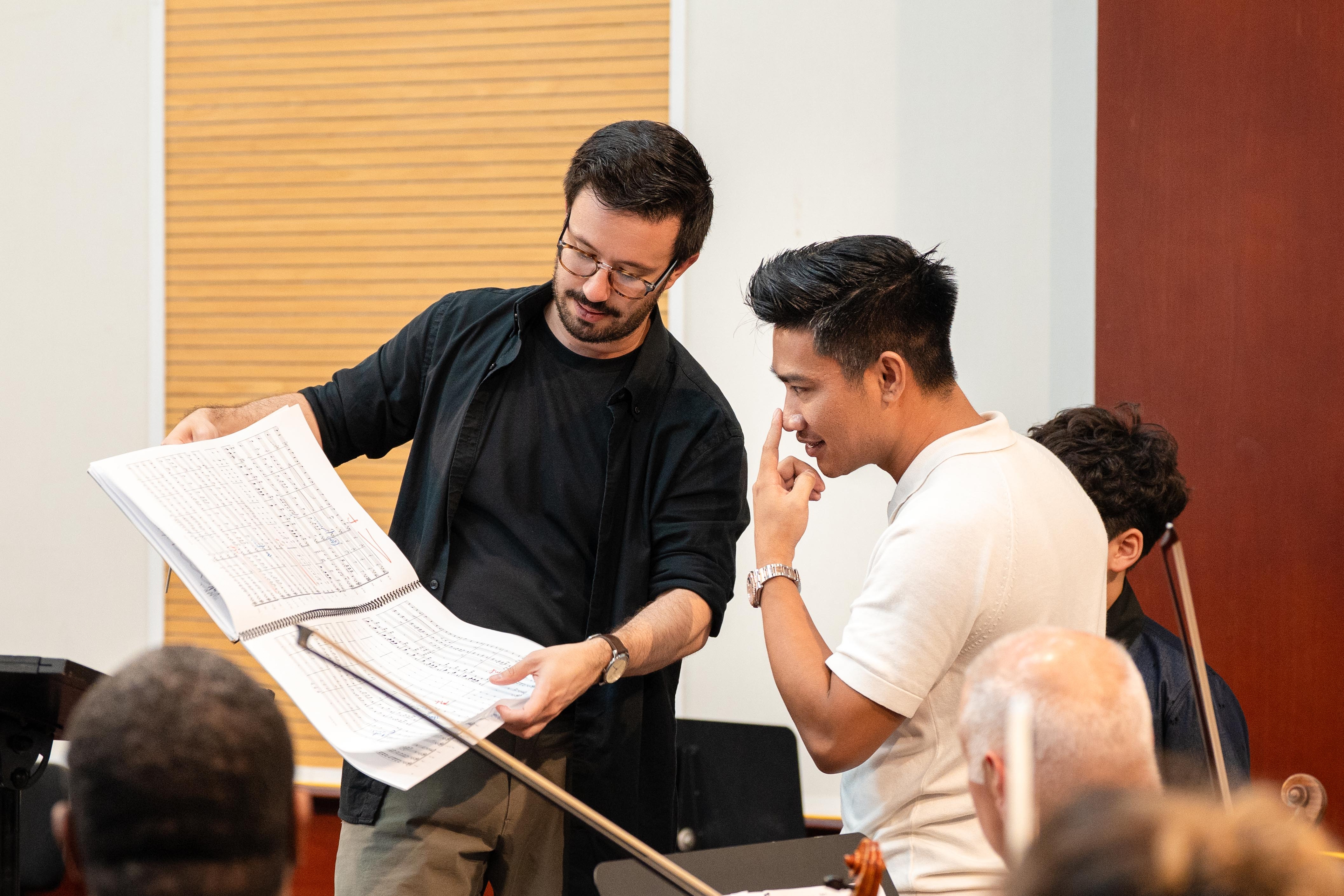 Nhạc trưởng Austin Chanu chỉ huy dàn nhạc trong buổi tổng duyệt, mỗi động tác baton là lời dẫn dắt mạch cảm xúc.