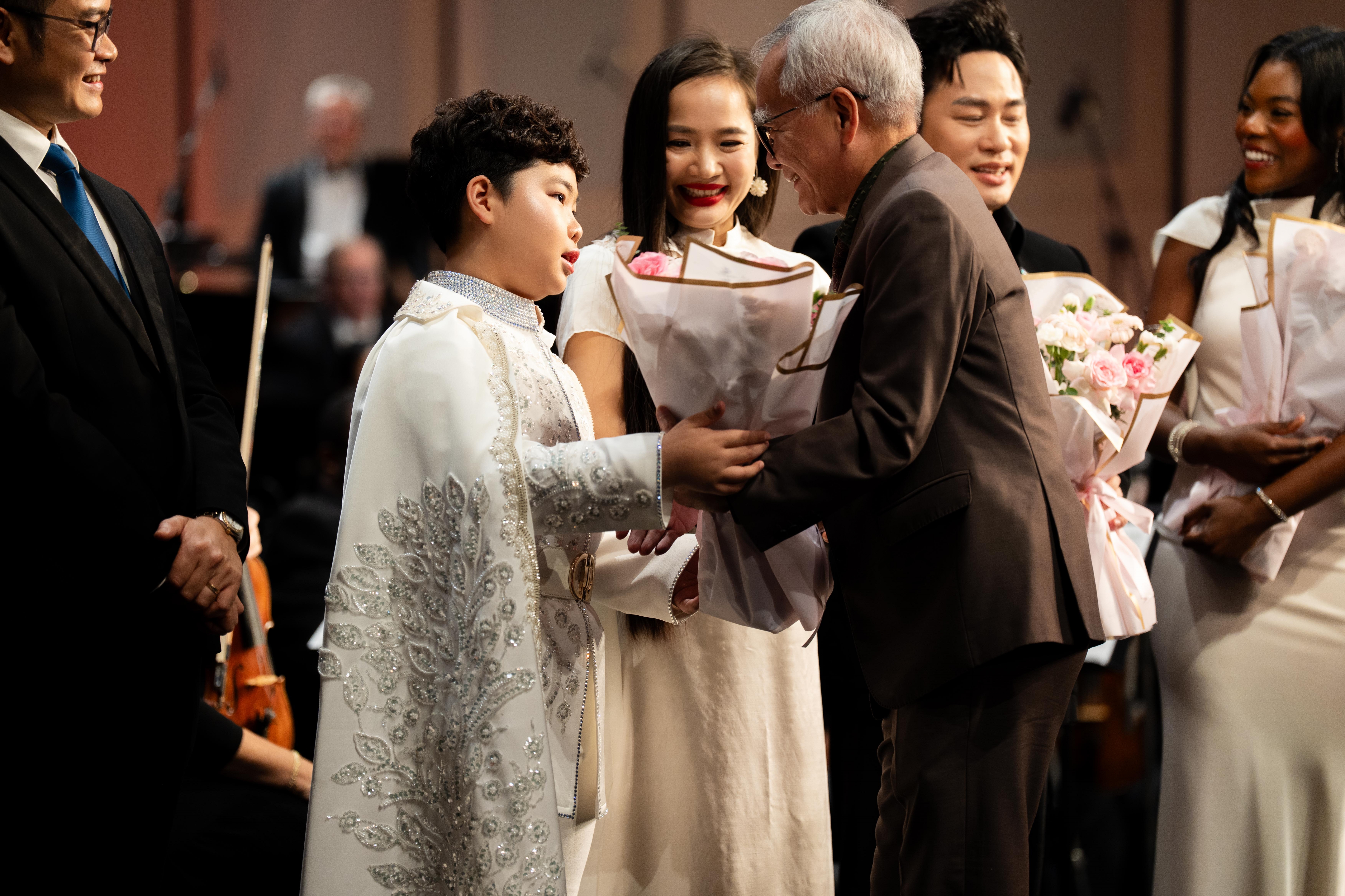 Ông Nguyễn Hải Giang, Phó Chủ tịch Hội Việt - Mỹ, trao hoa chúc mừng thần đồng opera 13 tuổi Dương Đức Hải - đại diện cho thế hệ trẻ trong hành trình giao lưu văn hóa giữa hai dân tộc.