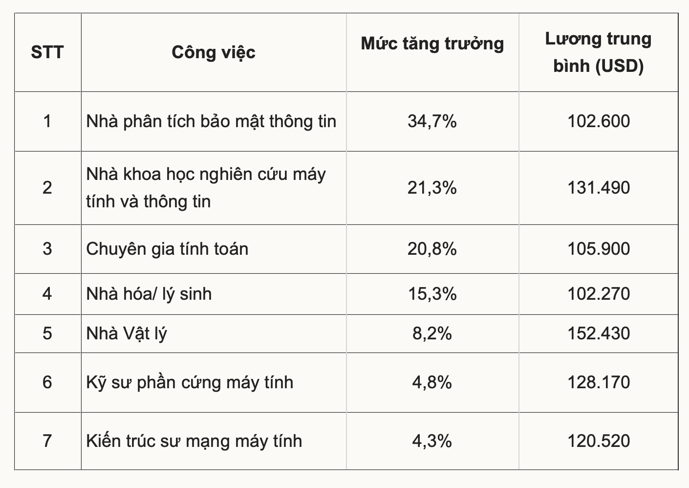 Về tiền lương, theo Cục Thống kê Lao động Mỹ, trong số những công việc STEM tăng trưởng mạnh, các nhà Vật lý đứng đầu với lương trung bình 152.000 USD một năm.