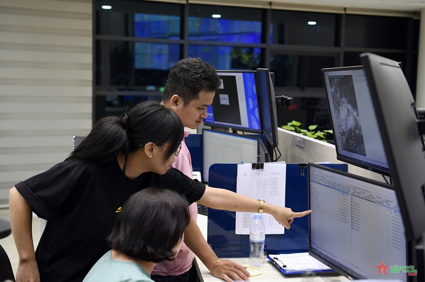 Những cán bộ ở Trung tâm Dự báo Khí tượng thuỷ văn quốc gia túc trực 24/24 để cập nhật tin tức về hướng đi của cơn bão số 3