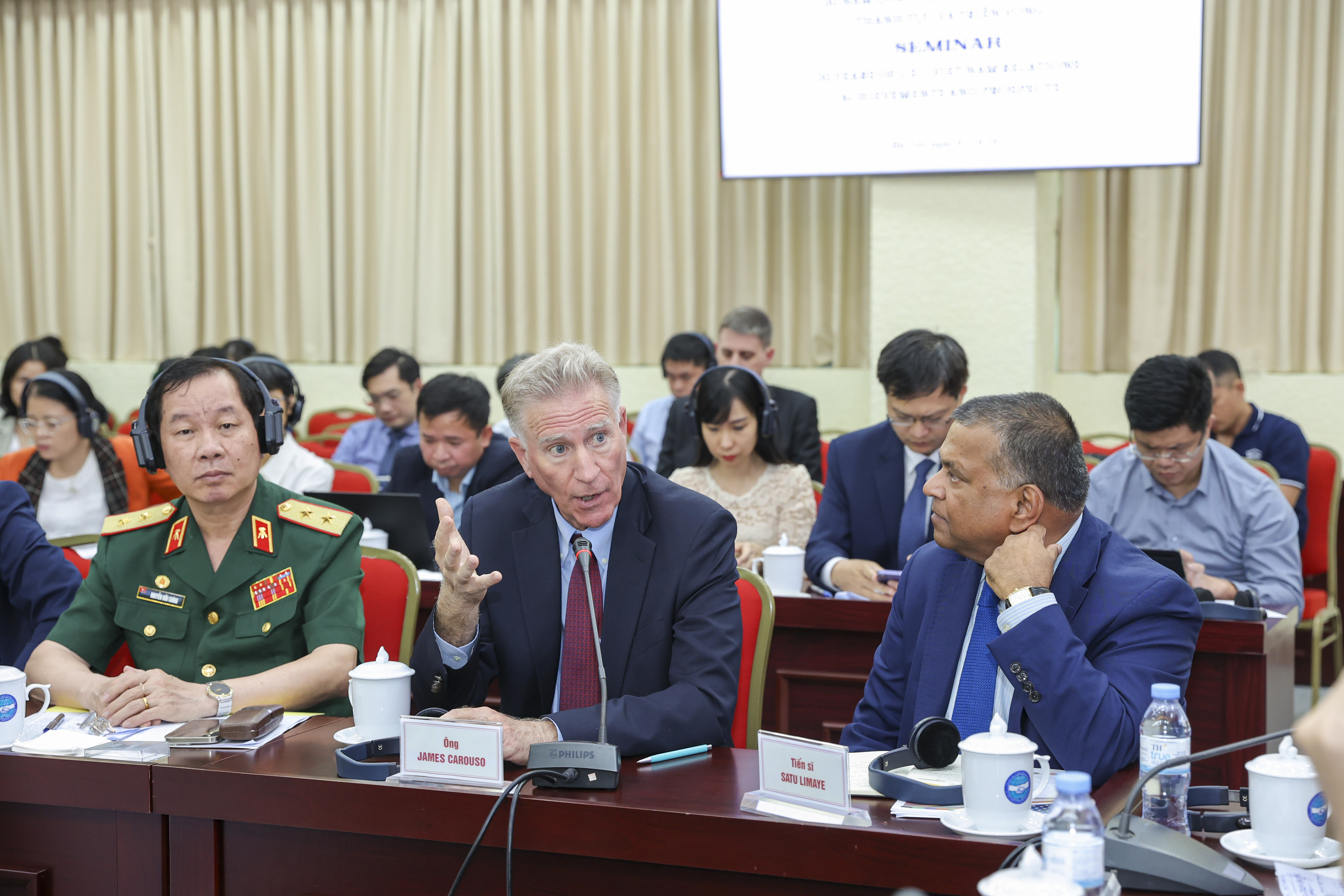 Ông James Carouso, cố vấn cấp cao Trung tâm Nghiên cứu Chiến lược và Quốc tế Mỹ (CSIS) (ở giữa) cùng Tiến sĩ Satu Limaye, Phó chủ tịch Trung tâm Đông - Tây, Giám đốc Trung tâm Đông - Tây (thứ nhất từ bên phải qua) thảo luận tại Hội thảo. (Ảnh: Đinh Hòa)