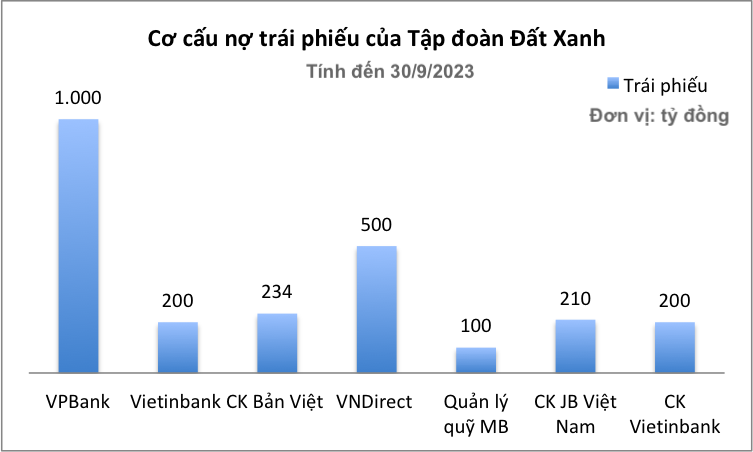 Bên cạnh đó, Đất Xanh còn huy động hàng nghìn tỷ đồng dưới hình thức phát hành trái phiếu cho các công ty chứng khoán, ngân hàng. Đơn cử: dư nợ trái phiếu chuyển đổi tại VPBank là 1.000 tỷ đồng, Công ty Chứng khoán Bản Việt là 234 tỷ đồng, VNDirect là 500 tỷ đồng, Công ty Quản lý quỹ đầu tư MB là 100 tỷ đồng, Chứng khoán JB Việt Nam là 210 tỷ đồng, Công ty Chứng khoán Vietinbank là 200 tỷ đồng…