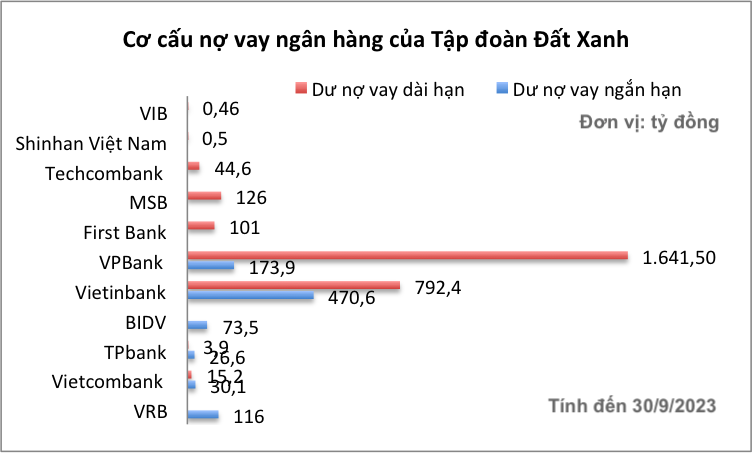 Xét cơ cấu nợ vay ngân hàng, đến cuối quý 3/2023, Tập đoàn Đất Xanh đang vay nợ tại 11 ngân hàng Việt Nam và chi nhánh ngân hàng nước ngoài, với tổng số nợ vay (gồm cả trái phiếu) là 3.922 tỷ đồng. Các khoản nợ vay ngân hàng là phục vụ tài trợ dự án, mua sắm tài sản, duy trì hoạt động…