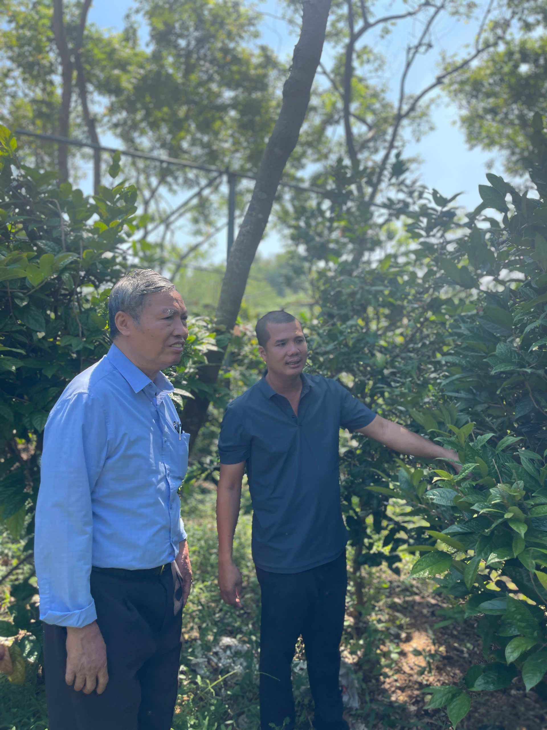 Giám đốc Công ty cổ phần đầu tư Thương mại dịch vụ Tam Đảo Trịnh Hoàng Trọng (bên phải) giới thiệu với PV Tạp chí điện tử Nông thông và Phát triển xem cây trà hoa vàng tại vườn nhà dưới chân núi Tam Đảo. Ảnh: Tiến Dũng