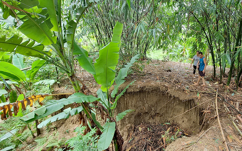 Nhiều chỗ đất trong vườn của gia đình bà Liên bị xói mòn tiềm ẩn nguy cơ sạt lở bất cứ lúc nào.