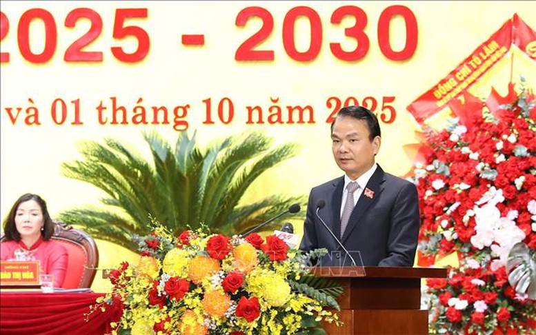 Đồng chí Đặng Xuân Phong, Ủy viên Trung ương Đảng, Bí thư Tỉnh ủy Ninh Bình nhiệm kỳ 2025 - 2030, phát biểu tại Đại hội - Ảnh: TTXVN