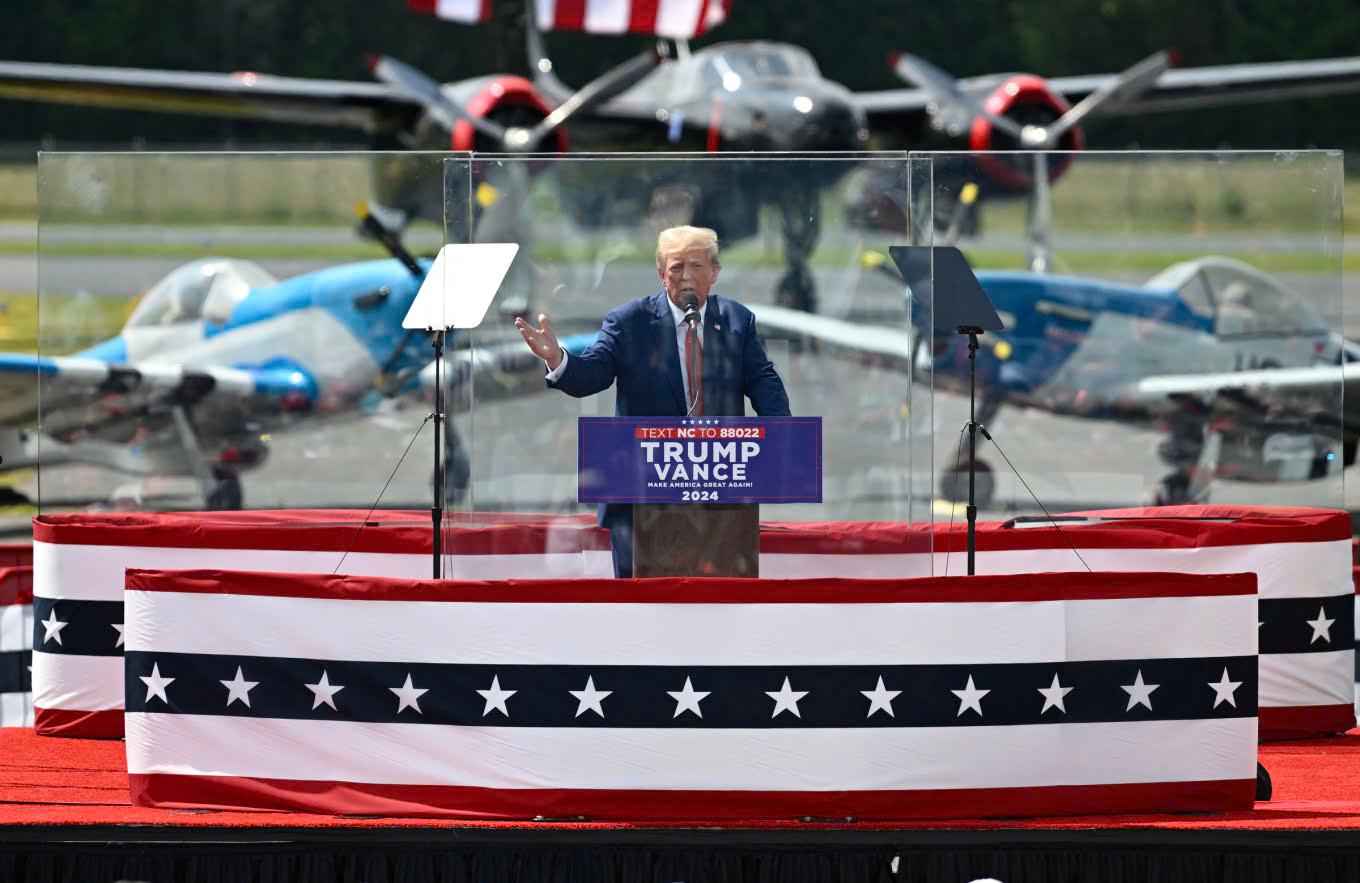 Trong buổi vận động ngoài trời tại bang Bắc Carolina, ông Donald Trump, ứng viên tổng thống đảng Cộng hòa, phát biểu từ phía sau tấm kính chống đạn – biện pháp an ninh vốn thường chỉ áp dụng cho các tổng thống đương nhiệm.