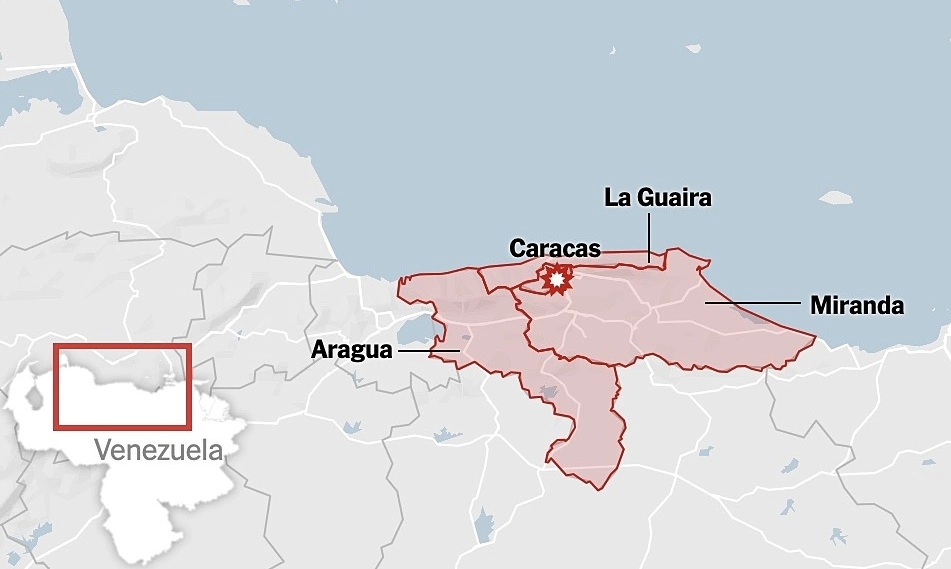 Vị trí thủ đô Caracas và ba tỉnh của Venezuela bị Mỹ tập kích rạng sáng 3/1. Đồ họa: Times