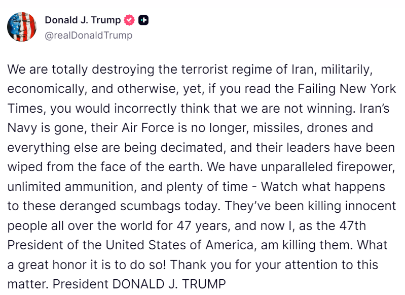 Trong bài đăng, Tổng thống Trump chỉ trích cách đưa tin của tờ The New York Times, cho rằng truyền thông này đã mô tả sai tình hình chiến sự. “Chúng ta đang phá hủy hoàn toàn chế độ khủng bố Iran, về quân sự, kinh tế và nhiều phương diện khác. Nhưng nếu đọc The New York Times đang thất bại, bạn có thể nghĩ sai rằng chúng ta không chiến thắng”, ông viết.