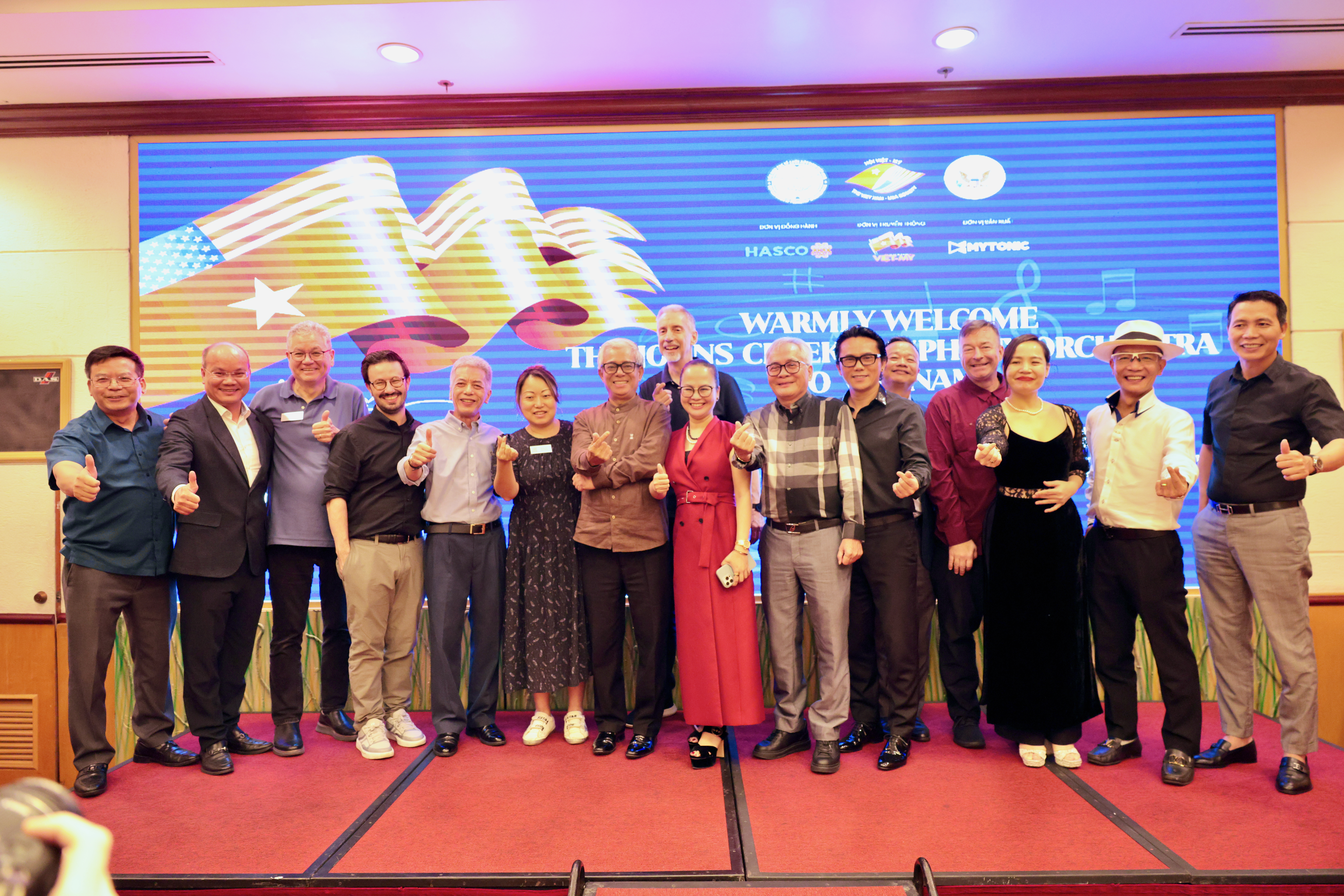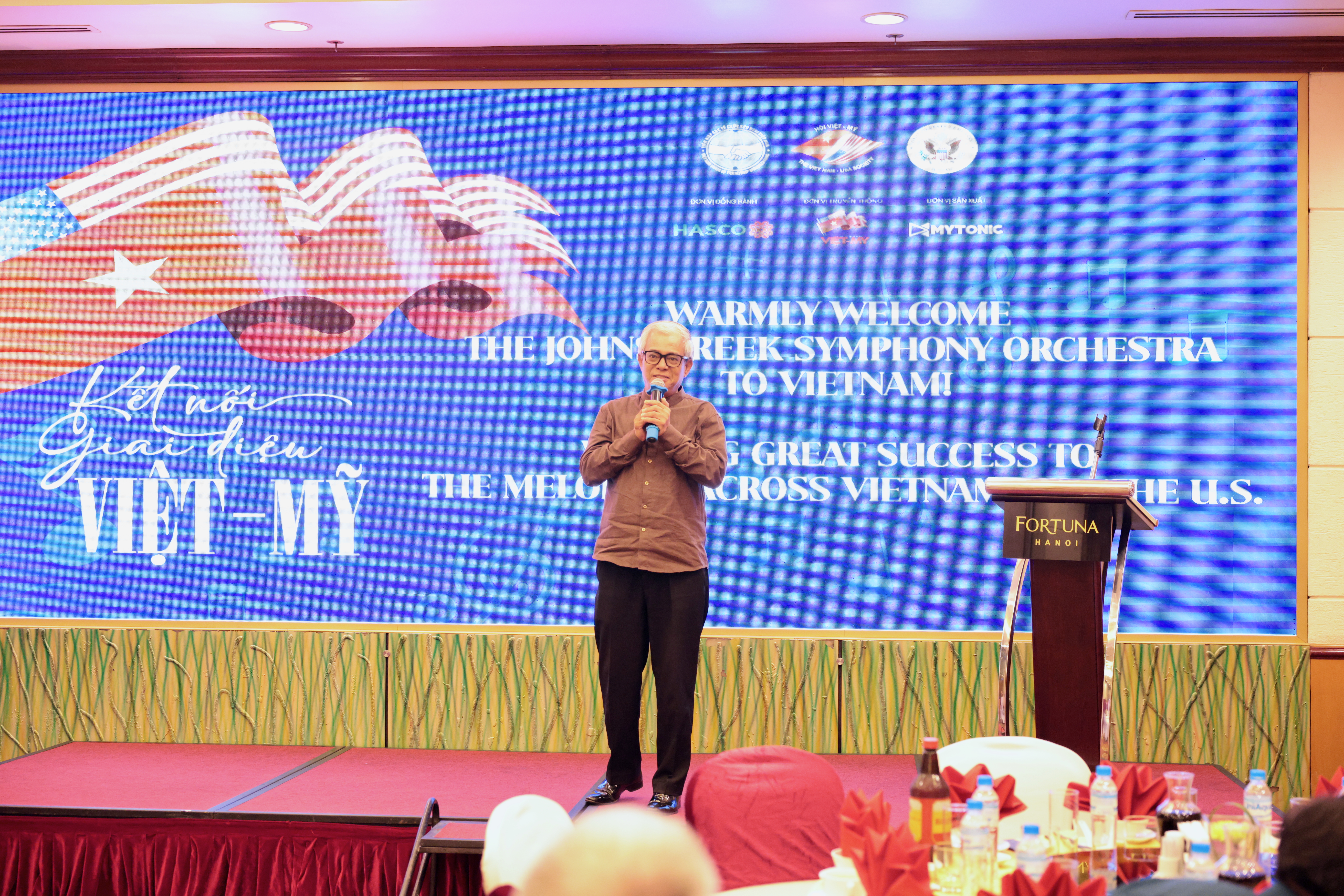 Thông điệp trên phông nền "WARMLY WELCOME THE JOHNS CREEK SYMPHONY ORCHESTRA TO VIETNAM!" hiện lên rõ nét. Lời phát biểu đầy tâm huyết đã nhận được sự lắng nghe chăm chú từ toàn thể khách mời, chính thức khởi đầu cho một đêm giao lưu đáng nhớ.
