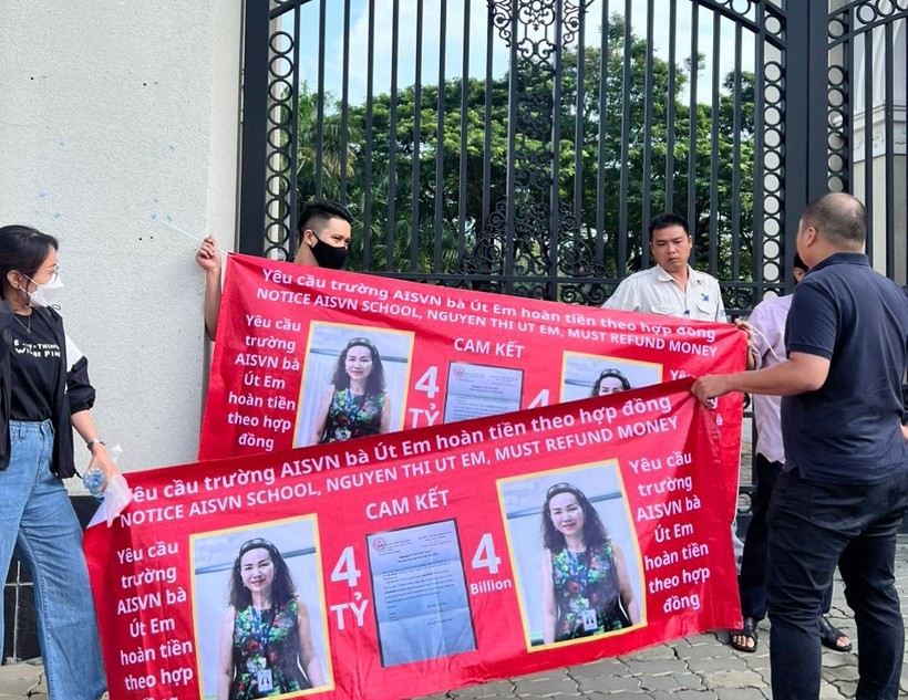 Cao điểm vào ngày 21/9, nhiều phụ huynh tập trung, căng băng rôn trước khu vực trường Trường Quốc tế Mỹ Việt Nam (AISVN) có trụ sở tại Nhà Bè, Thành phố Hồ Chí Minh để đòi nợ.