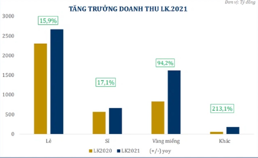 Doanh thu vàng miếng tăng 94,2% trong 2 tháng đầu năm 2021, riêng trong dịp lễ Thần Tài 2021, doanh thu vàng miếng đạt mức tăng trưởng 72,8% so dịp lễ Thần Tài 2020. Tỷ trọng doanh thu vàng miếng tăng lên mức 31,5% trong cơ cấu doanh thu của công ty.