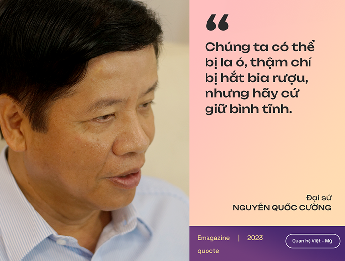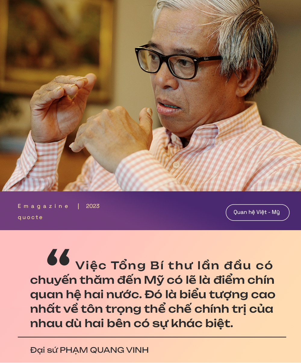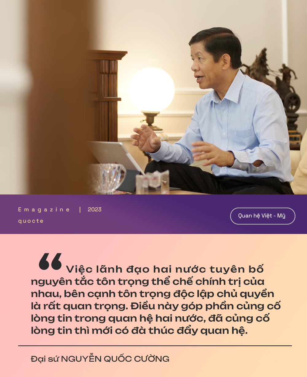 Năm 2013, Chủ tịch nước Trương Tấn Sang có chuyến thăm chính thức đến Mỹ. Đây mới là chuyến thăm chính thức của một Chủ tịch nước ta đến Mỹ lần thứ hai trong gần 20 năm. Chuyến thăm đầu tiên là của Chủ tịch nước Nguyễn Minh Triết vào năm 2007.Năm 2013, chuyến thăm này của chủ tịch nước Trương Tấn Sang đánh dấu một mốc quan trọng trong quan hệ hai nước: nâng cấp lên quan hệ Đối tác toàn diện.Gần 20 năm sau khi hai nước bình thường hóa quan hệ, Mỹ trở thành thị trường xuất khẩu lớn nhất của Việt Nam. Xuất khẩu từ Việt Nam sang Mỹ đạt mốc 20 tỷ USD, gấp gần 100 lần so với năm 1995 - thời điểm hai nước thiết lập quan hệ ngoại giao. Chủ tịch nước Trương Tấn Sang hội kiến Tổng thống Mỹ Barack Obama trong chuyến công du tới Mỹ năm 2013. Ảnh: AFP Chuyến thăm diễn ra trong bối cảnh quan hệ hai nước đã có bước phát triển khá toàn diện trên nhiều lĩnh vực khác nhau. Lãnh đạo hai nước đều cảm nhận rằng đã đến lúc xác định một khuôn khổ mới cho quan hệ giữa Việt Nam và Mỹ, Đại sứ Nguyễn Quốc Cường, nguyên Thứ trưởng Bộ Ngoại giao, Đại sứ Việt Nam tại Mỹ vào thời điểm đó cho biết.Quan hệ giữa Việt Nam - Mỹ có những điểm phức tạp: hai nước trải qua cuộc chiến, di chứng và hậu quả chiến tranh rất lớn và không phải là không có những tiếng nói trái chiều ở cả hai bên, nguyên Đại sứ Việt Nam tại Mỹ cho hay."Tôi cảm nhận được ở phía Mỹ, có những người rất nhiệt tình, thúc đẩy quan hệ với Việt Nam, nhưng cũng có những người vẫn giữ thái độ dè dặt", ông Cường nhớ lại, nhắc lại các chuyến đi đến khoảng 40 bang của mình.Để vượt qua những điều đó, từ hai nước cựu thù, trở thành đối tác toàn diện, theo Đại sứ Cường, điều quan trọng là phải xây dựng được lòng tin với nhau. "Để có quan hệ tốt với nhau, giữa con người cần có lòng tin, thì giữa quốc gia với quốc gia càng cần có lòng tin", ông Cường nói.Chính vì vậy, khi quyết định nâng cấp quan hệ, điều quan trọng nhất trong công tác chuẩn bị cũng như thống nhất giữa lãnh đạo hai nước là phải xác định rõ ràng các nguyên tắc của đối tác toàn diện giữa Việt Nam và Mỹ. Đó là: Dựa trên cơ sở Hiến chương Liên Hợp Quốc, luật pháp quốc tế, trên cơ sở tôn trọng thể chế chính trị của nhau, tôn trọng độc lập chủ quyền và toàn vẹn chủ quyền lãnh thổ của nhau.Trong tất cả các Tuyên bố chung Việt Nam thiết lập Đối tác toàn diện hay Đối tác chiến lược với các nước khác nhau duy nhất với Mỹ mới có nguyên tắc tôn trọng thể chế chính trị của nhau, điều này cũng thể hiện sự đặc thù trong quan hệ hai nước.Việc lãnh đạo hai nước tuyên bố nguyên tắc tôn trọng thể chế chính trị của nhau, bên cạnh tôn trọng độc lập chủ quyền là rất quan trọng. Điều này góp phần củng cố lòng tin trong quan hệ hai nước, đã củng cố lòng tin thì mới có đà thúc đẩy quan hệ. Cũng trong năm 2013, ông Cường là Đại sứ Việt Nam đầu tiên tham dự cuộc gặp thường niên của Liên đoàn những gia đình có con em chết và mất tích trong cuộc chiến tranh Đông Dương của Mỹ. Cuộc gặp có khoảng 400 - 500 gia đình tướng tá, kể cả cựu quan chức trong chính quyền Mỹ đến dự. Liên đoàn từng phản đối gay gắt việc bình thường hóa quan hệ với Việt Nam.Năm 2013, ông là Đại sứ Việt Nam tại Mỹ được mời làm diễn giả chính trong buổi đầu tiên. Ông Cường nhận lời mời với suy nghĩ việc hợp tác trong giúp đỡ tìm kiếm người Mỹ mất tích trong chiến tranh cả đơn phương và song phương có ý nghĩa rất lớn.Tuy vậy, ông cũng chuẩn bị tinh thần có thể họ sẽ có những phản ứng cực đoan, dù có an ninh tháp tùng. "Chúng ta có thể bị la ó, thậm chí bị hắt bia rượu, nhưng hãy cứ giữ bình tĩnh", ông nói với phu nhân. Tại buổi gặp mặt, ông Cường đã bắt đầu bài phát biểu bằng chính trải nghiệm của mình trong chiến tranh. Ông kể về tuổi thơ sinh ra trong gia đình có 5 anh chị em. Bố mẹ công tác ở Hà Nội còn 5 anh chị em đi sơ tán khỏi Thủ đô. 5 anh em phải sơ tán ở những nơi khác nhau, để nếu không may bom Mỹ rơi xuống, thì trong số 5 anh chị em vẫn có người sống sót.Ở nơi sơ tán, hầu như đêm nào ông cũng phải thức dậy 4 - 5 lần để chui xuống hầm trú ẩn để tránh bom Mỹ. "Ước mơ của đứa trẻ 9 - 10 tuổi lúc đó không phải là bố mẹ lên thăm, cũng không phải tôi được về Hà Nội mà chỉ là một đêm ngủ ngon giấc không có máy bay Mỹ đánh phá. Rất may là cả 5 anh chị em còn sống sót trở về. Nhưng không phải gia đình người Việt Nam nào cũng may mắn như vậy", ông nói.Cả hội trường lặng đi.Vị Đại sứ Việt Nam tiếp tục nói các nỗ lực của Việt Nam từ đơn phương tìm kiếm trao trả hài cốt lính Mỹ cho đến hợp tác song phương. "Tôi mong muốn hai bên cùng thúc đẩy nhanh hơn nữa vì thời gian không ủng hộ chúng ta", ông Cường nói.Mọi ng