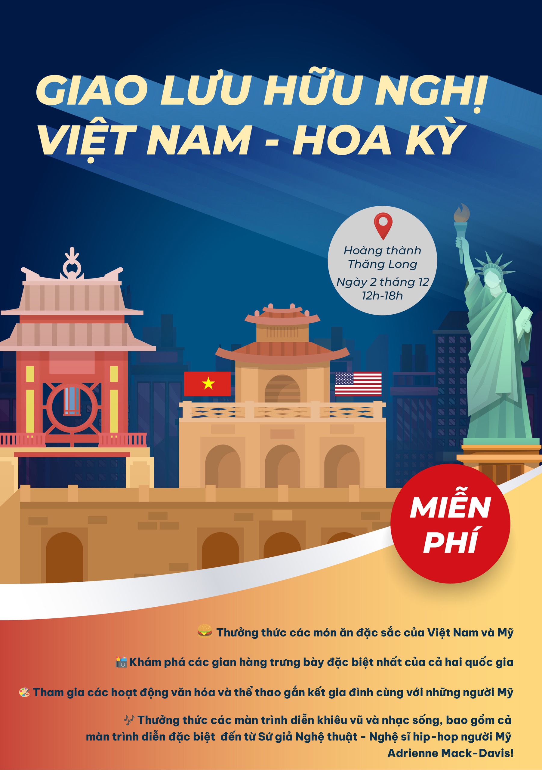 Thông tin từ Đại sứ quán Hoa Kỳ cho biết, Lễ hội Giao lưu hữu nghị Việt Nam - Hoa Kỳ để kỷ niệm Quan hệ Đối tác Chiến lược toàn diện giữa hai quốc gia sẽ được tổ chức từ 12h-18h ngày 2/12, tại Hoàng thành Thăng Long (Hà Nội).