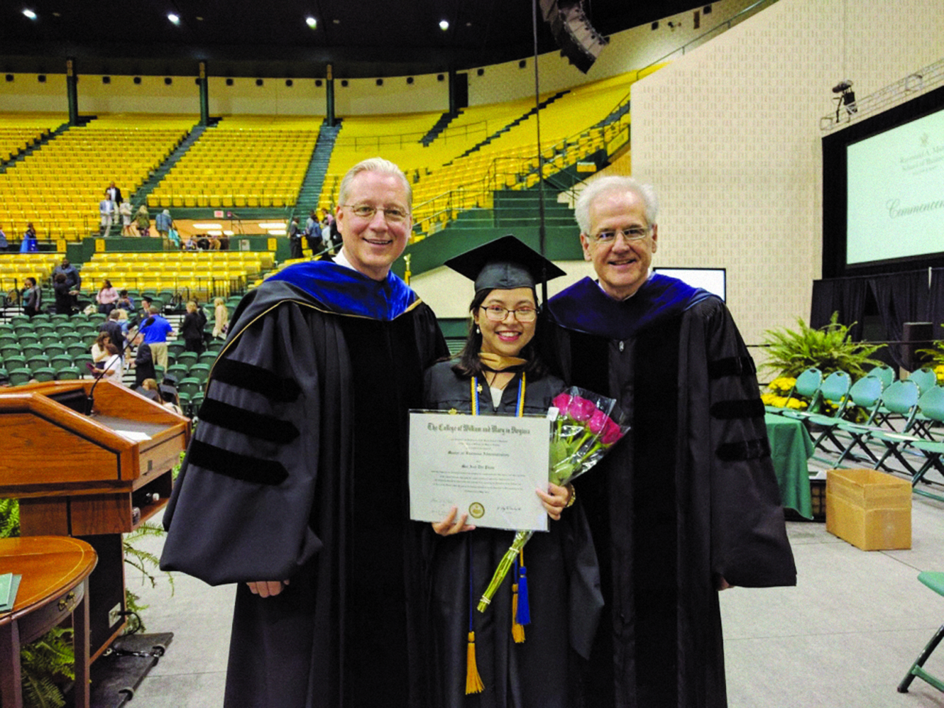 Mai Anh cùng 2 thầy Hiệu trưởng, Hiệu phó Trường Kinh doanh Mason William and Mary mà cô theo học