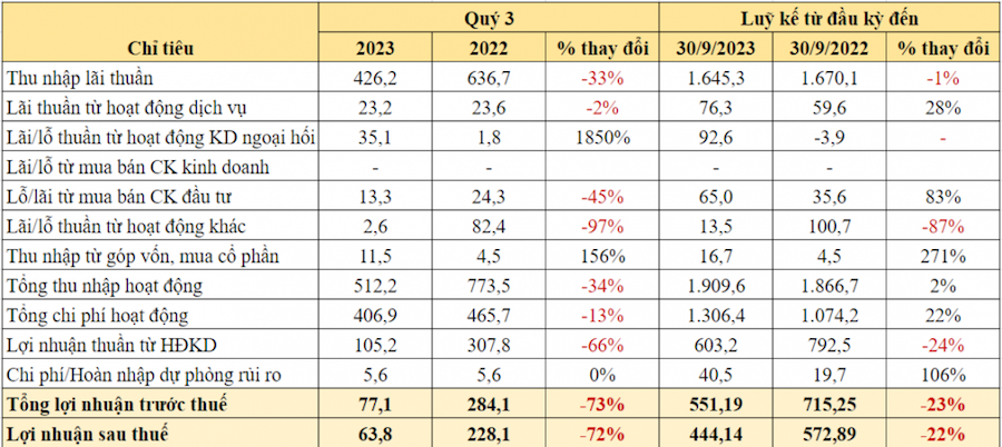 Cụ thể, trong quý 3/2023, ngân hàng ghi nhận thu nhập lãi chỉ đạt 426,2 tỷ đồng, giảm 33% so với cùng kỳ năm 2022.