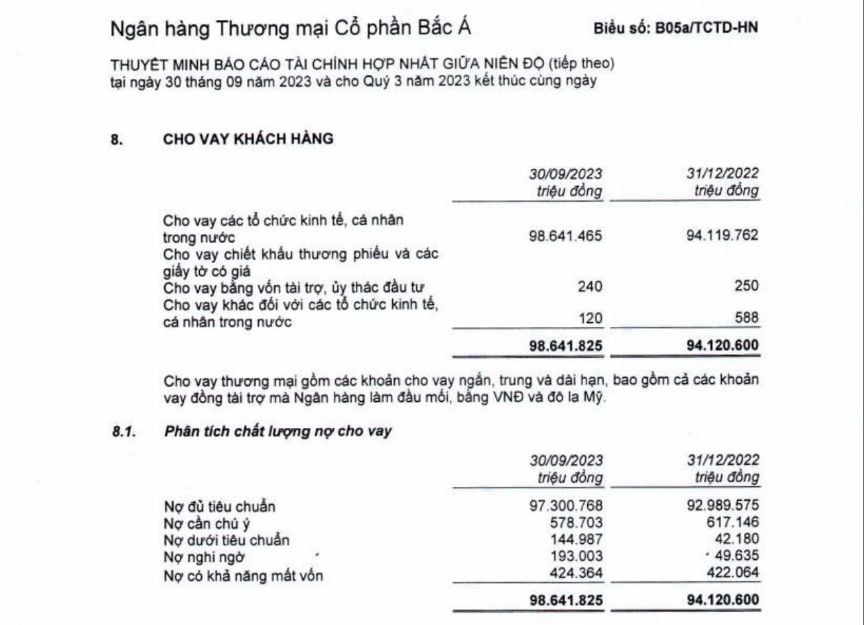 Xét về cơ cấu nợ xấu, báo cáo Quý 3 ghi nhận nợ dưới tiêu chuẩn (nợ xấu nhóm 3) và nợ nghi ngờ (nợ xấu nhóm 4) của Bac A Bank tăng mạnh 245% và 289% so với cuối năm 2022, lần lượt lên 145 tỷ đồng và 193 tỷ đồng. Nợ có khả năng mất vốn hơn 426 tỷ đồng…