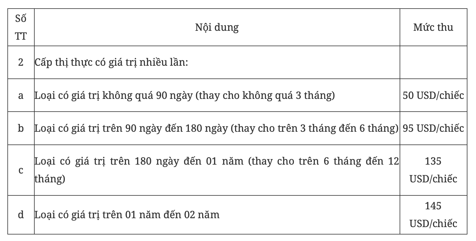 Thông tư số 62/2023/TT-BTC sửa đổi, bổ sung Mục 2 Phần II Biểu mức thu phí, lệ phí. Cụ thể, phí cấp thị thực và các giấy tờ khác có giá trị xuất cảnh, nhập cảnh, cư trú cho người nước ngoài như sau: