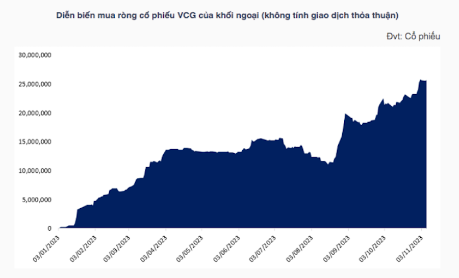 Tính từ đầu năm 2023, khối ngoại đã mua ròng tổng cộng khoảng 26 triệu cổ phiếu (không tính giao dịch thỏa thuận), hiện tỷ lệ sở hữu nước ngoài tại Vinaconex giảm từ 45,22% còn 38,46% vốn điều lệ tính đến hết ngày 8/11.