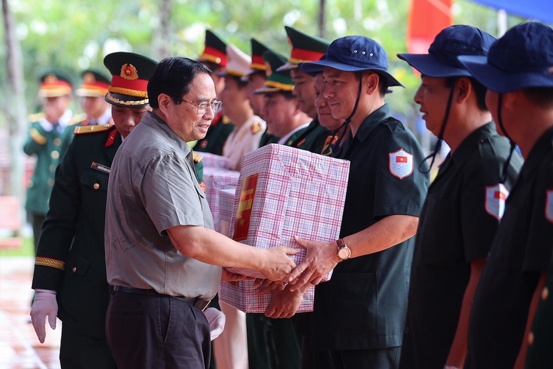 Thủ tướng Phạm Minh Chính tặng quà các đội tìm kiếm, quy tập hài cốt liệt sĩ Quân khu 9. Ảnh CP