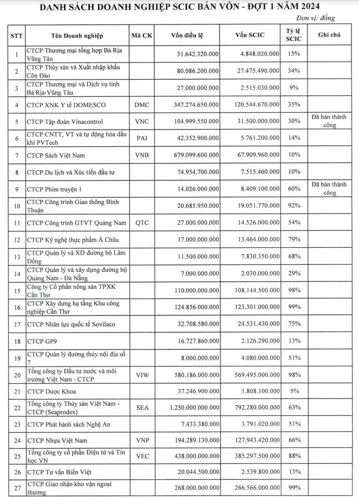 Trong danh sách thoái vốn đợt 1 năm 2024, SCIC dự kiến thực hiện thoái vốn tại 27 doanh nghiệp, ít hơn so với danh sách 73 doanh nghiệp của năm 2023.