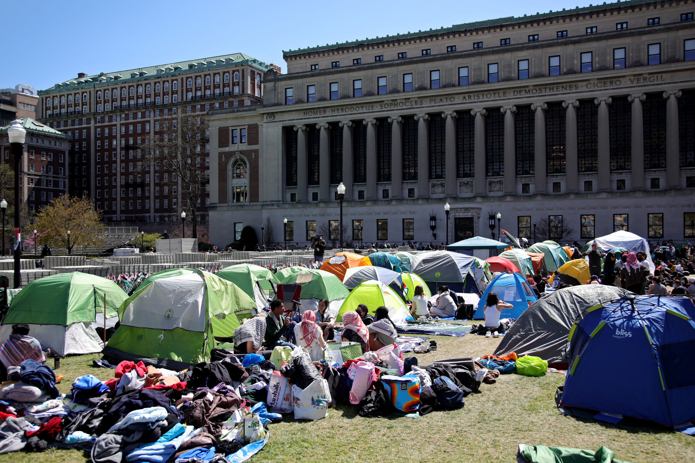Hàng trăm sinh viên dựng lều tại Bãi cỏ Nam trong khuôn viên Đại học Columbia ở New York, vẫy cờ Palestine, hô vang khẩu hiệu phản đối "cuộc diệt chủng" ở Gaza, ngày 25/4.