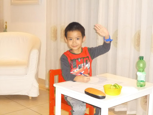 Phạm Anh Minh 6 tuổi đang ngồi giải toán Mathe Olympiade ở nhà cuối tuần.