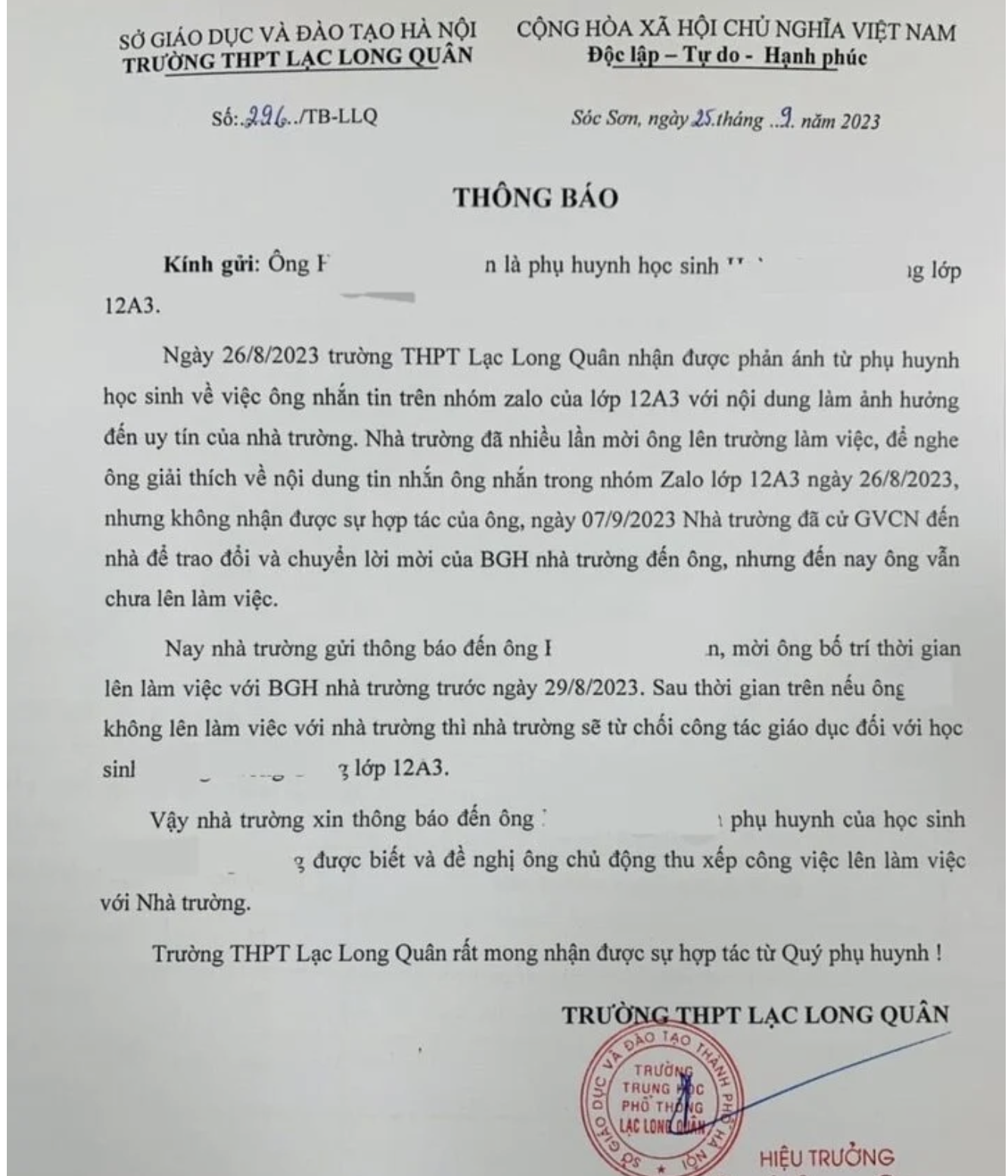 Ngày 25/9, trường THPT Lạc Long Quân tiếp tục gửi thông báo mời phụ huynh làm việc. Thông báo nêu rõ: "Nếu ông không lên làm việc, nhà trường sẽ từ chối công tác giáo dục đối với học sinh".