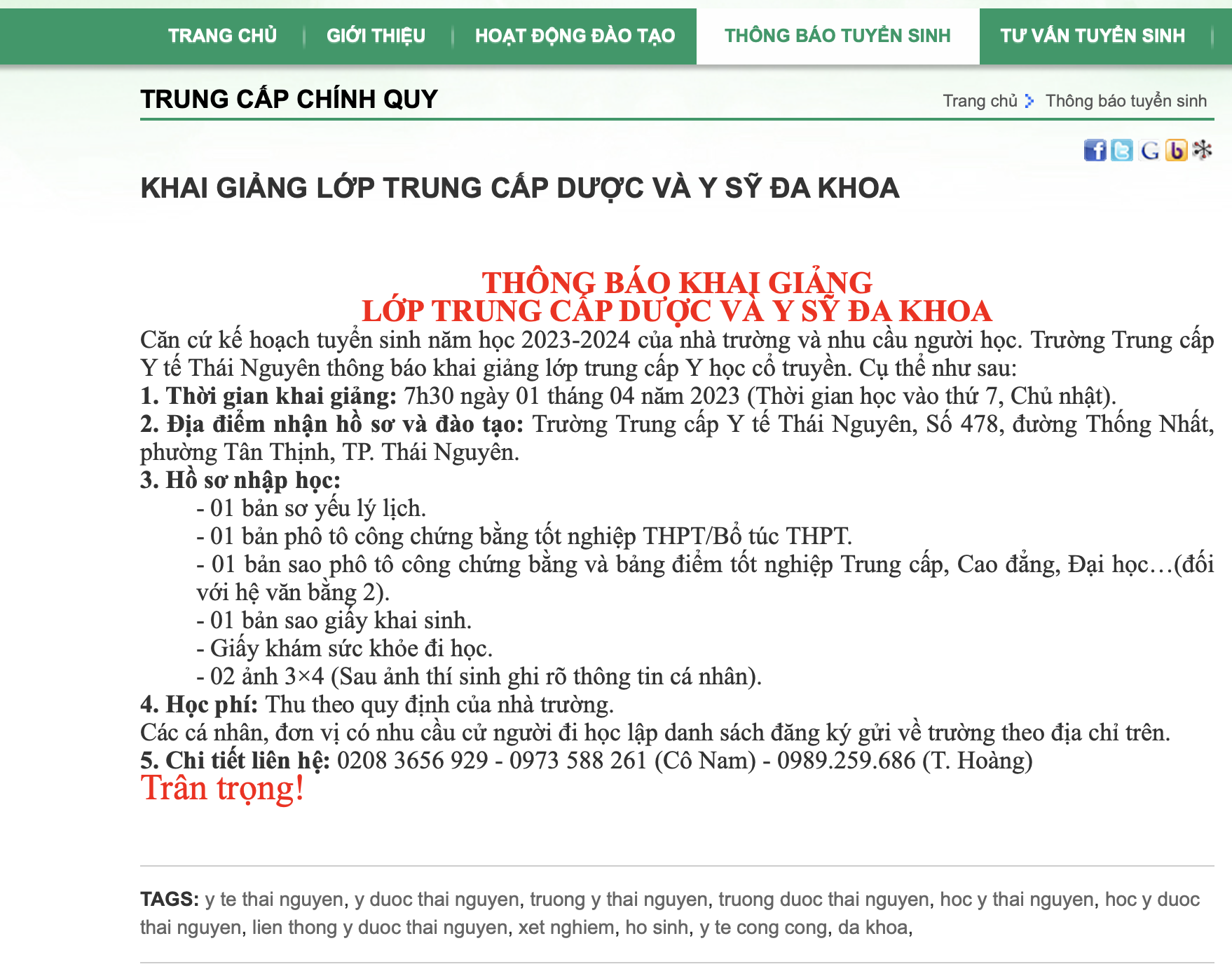Lấy ví dụ trong việc tuyển sinh, đào tạo tại trường Trung cấp Y tế Thái Nguyên. Ngôi trường này cũng có nhiều thâm niên trong lĩnh vực đào tạo Trung cấp ngành Y – Dược.