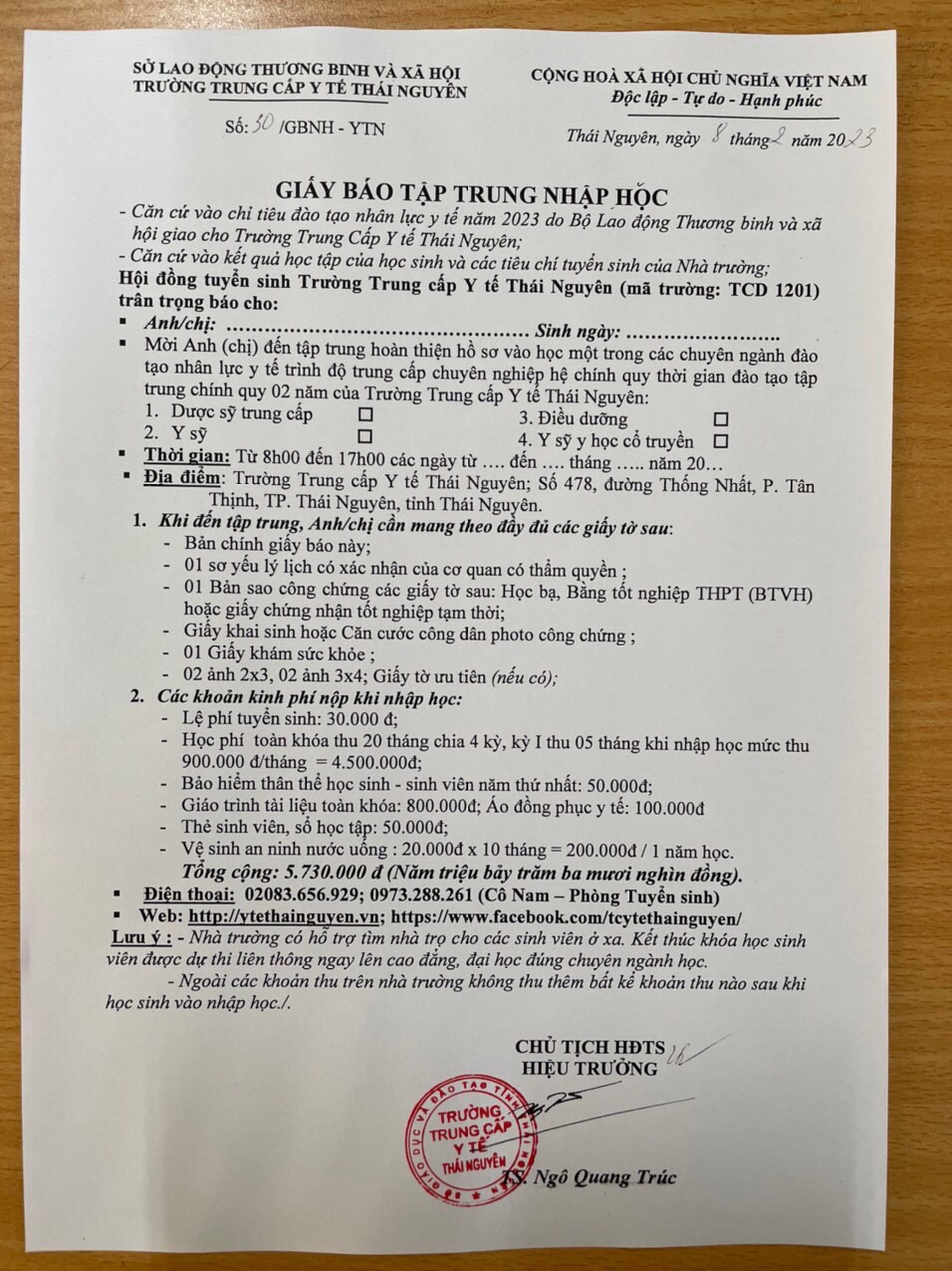 Thông báo tuyển sinh, khai giảng của trường Trung cấp Y tế Thái Nguyên từ tháng 4/2023