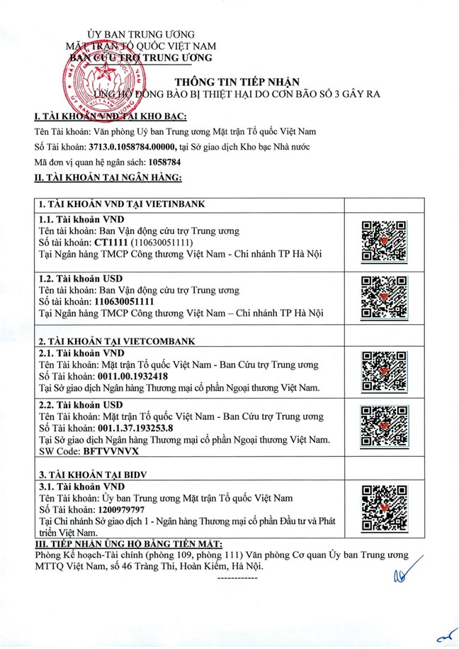 Ban Vận động cứu trợ trung ương cũng đã đăng tải cụ thể danh sách các tổ chức, cá nhân ủng hộ qua số tài khoản Vietcombank 0011001932418 từ ngày 1/9 đến ngày 10/9/2024. Cụ thể danh sách này gồm 12.028 trang và sẽ liên tục được cập nhật. Trong danh sách này, thống kê chi tiết ngày, số tiền cũng như nội dung giao dịch của người dân. Từ những giao dịch vài nghìn đồng đến hàng trăm triệu đồng, tất cả đều là tấm lòng của nhân dân cả nước để ủng hộ đến những đồng bào chịu ảnh hưởng do bão số 3.