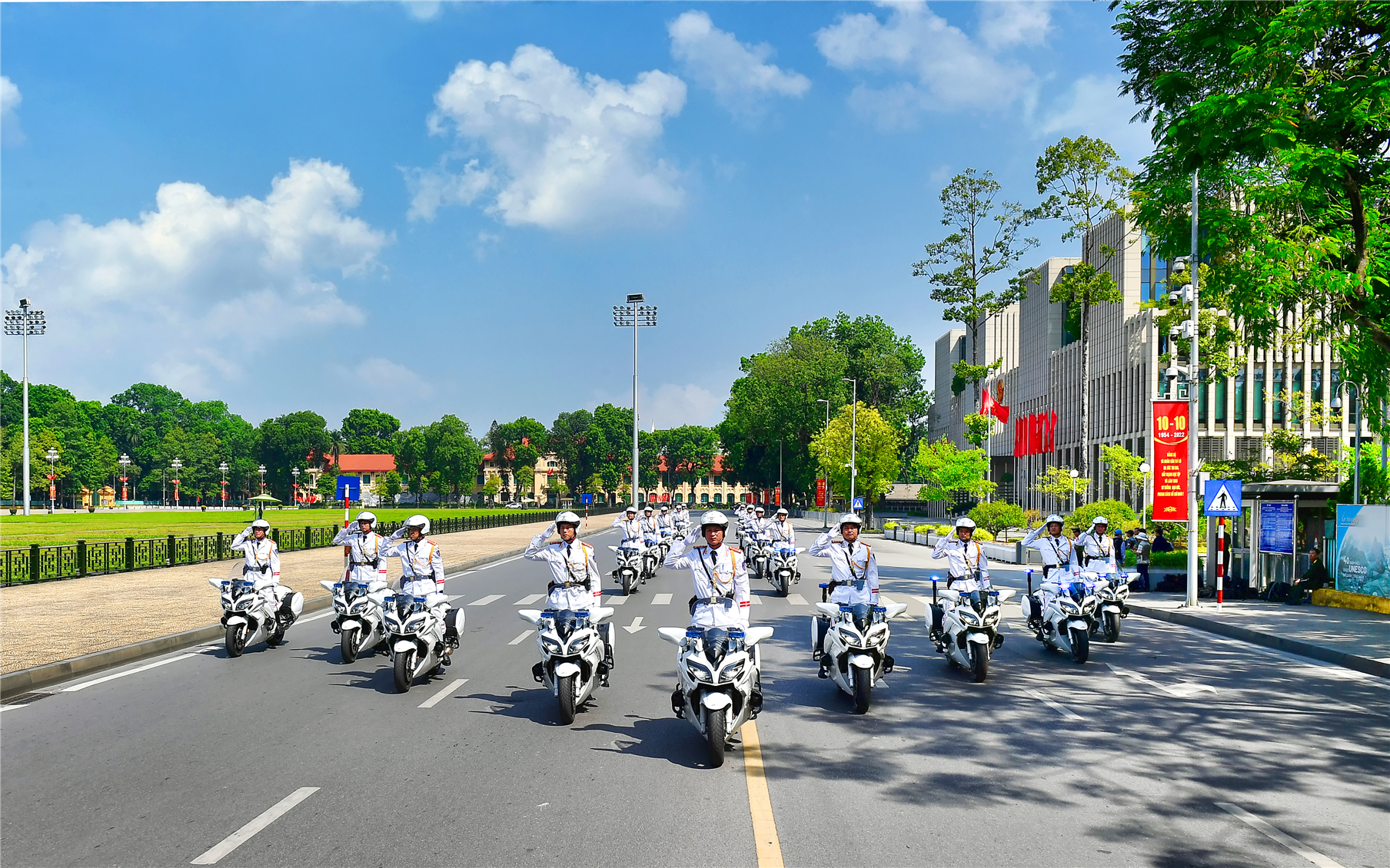 Đội hình mô tô hộ tống của lực lượng Cảnh vệ luyện tập.Ảnh: Bộ Công an