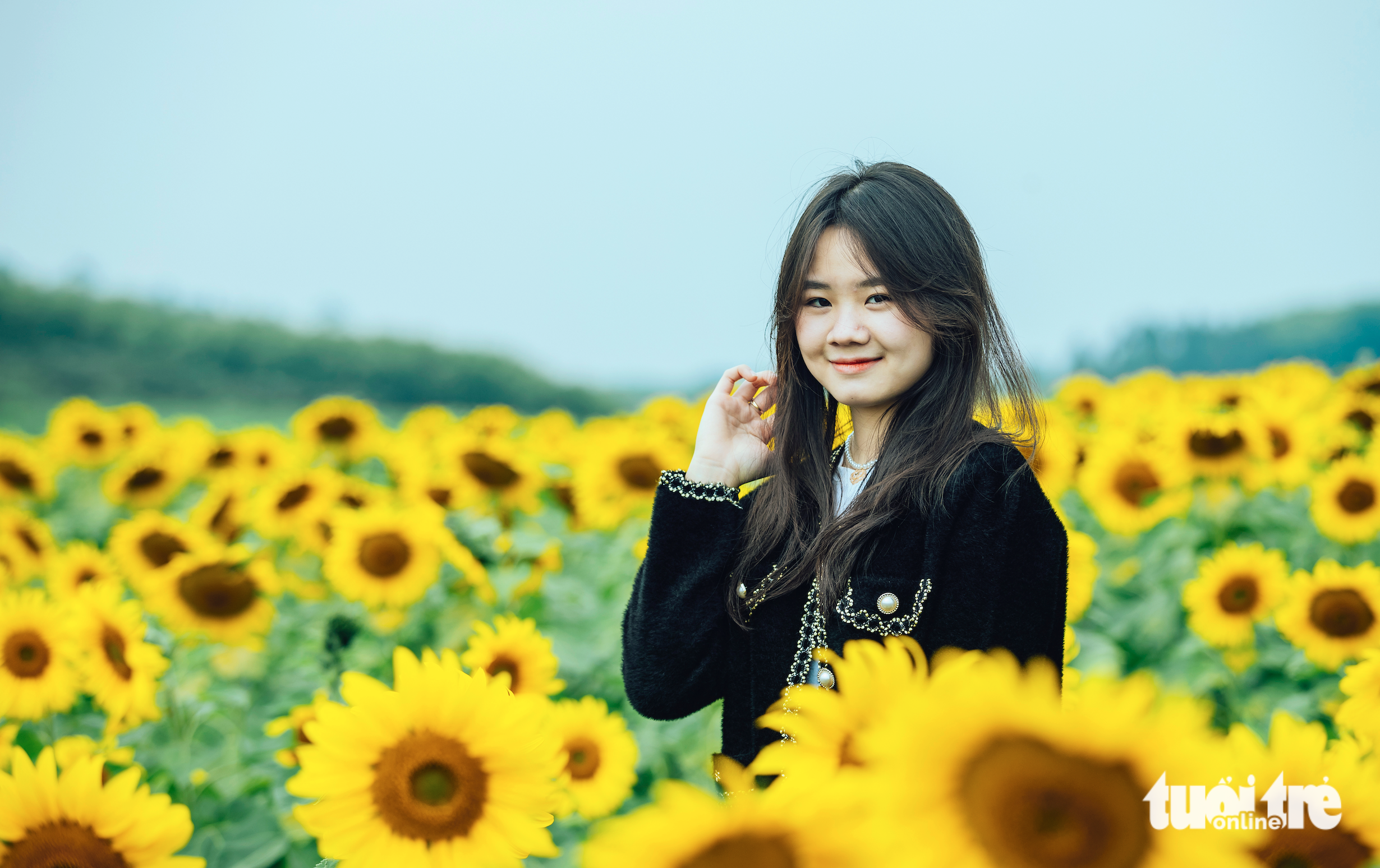 A woman poses with sunflowers in Nghe An Province, Vietnam, January 2, 2022. Photo: Rang Dong / Tuoi Tre
