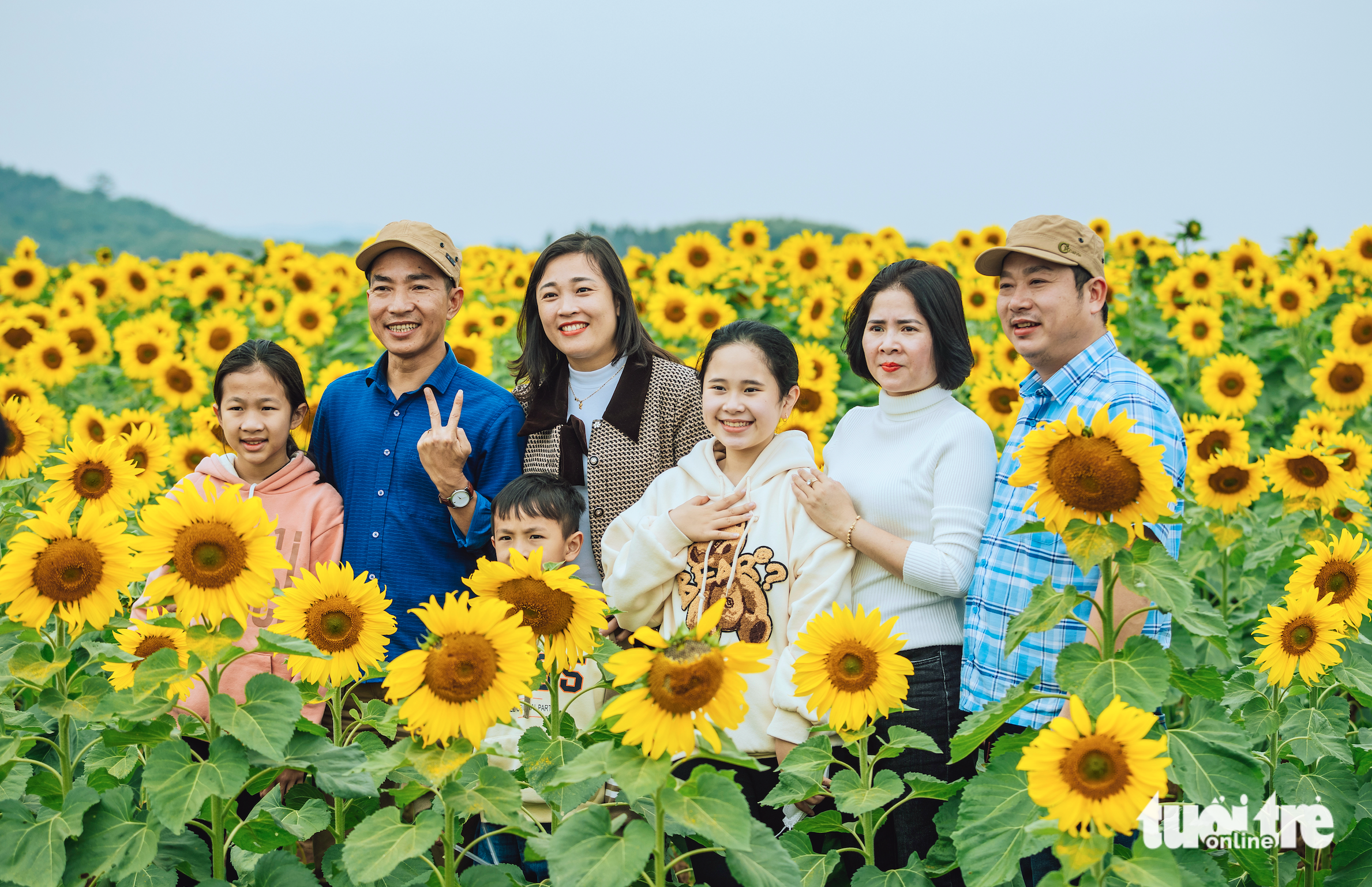 A family with sunflowers in Nghe An Province, Vietnam, January 2, 2022. Photo: Rang Dong / Tuoi Tre