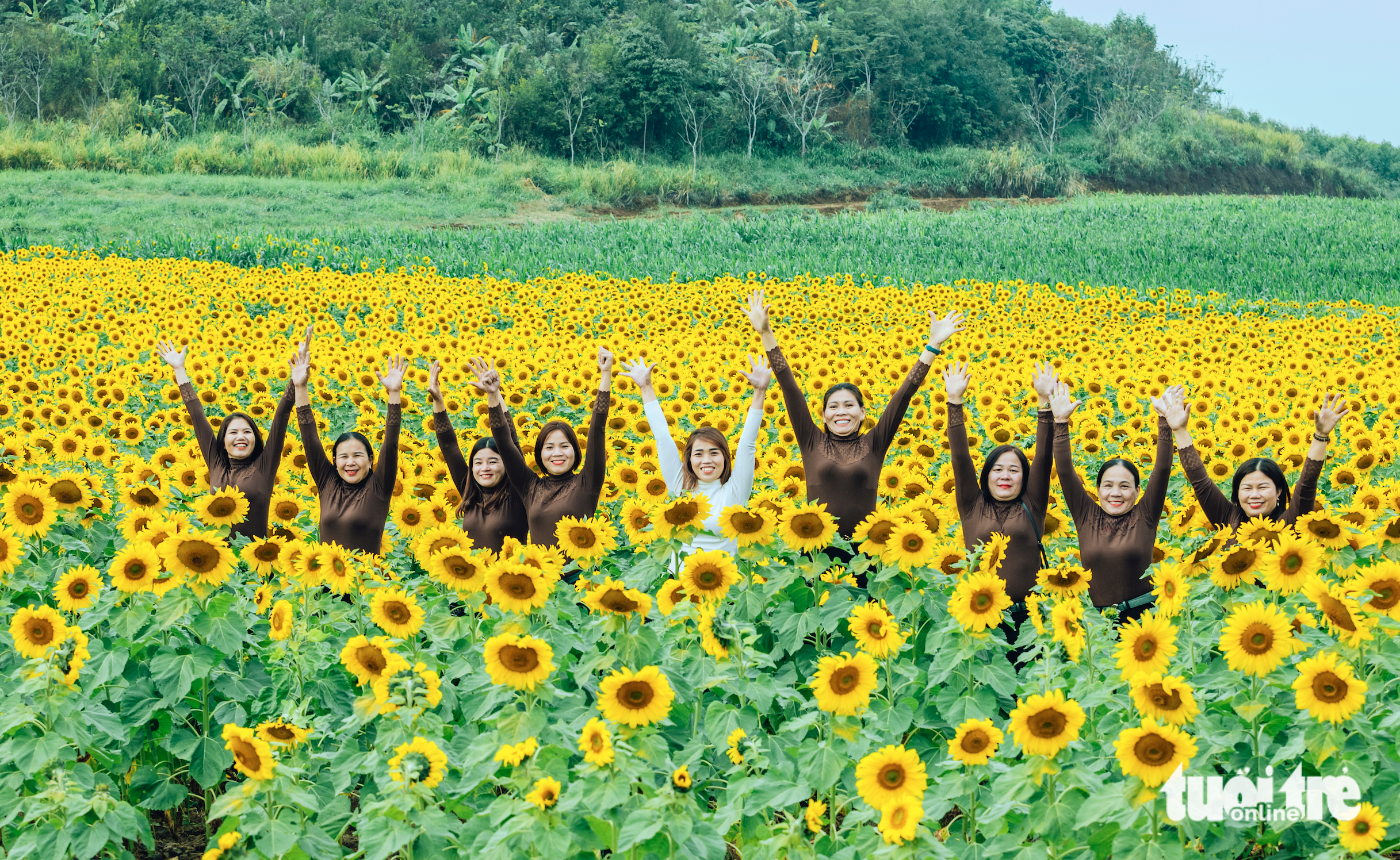 Visitors pose with sunflowers in Nghe An Province, Vietnam, January 2, 2022. Photo: Rang Dong / Tuoi Tre