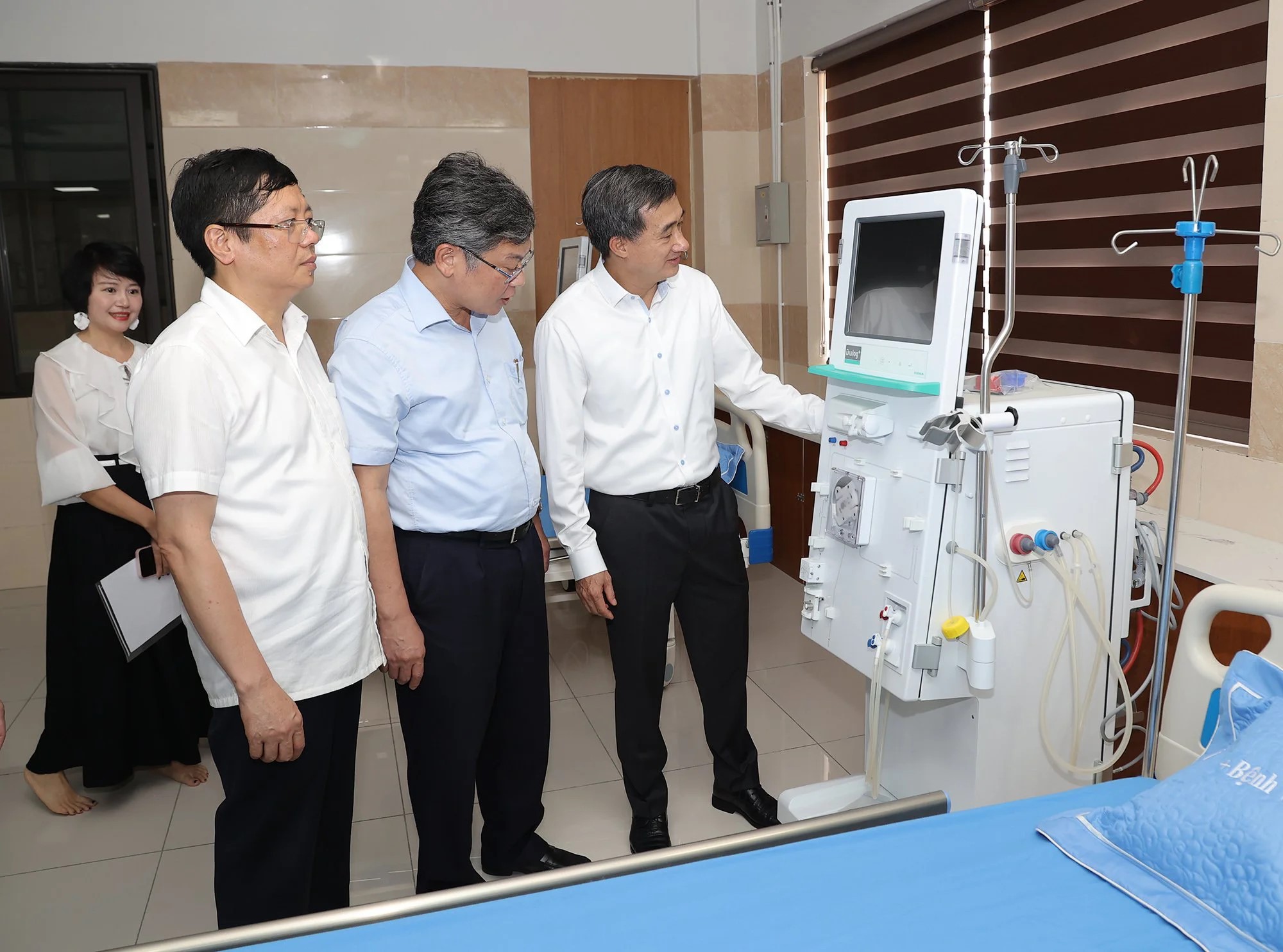 Thứ trưởng Bộ Y tế Trần Văn Thuấn, Lãnh đạo tỉnh Hưng Yên và huyện Văn Giang thăm khu vực hệ thống lọc RO và lọc rửa quả lọc; máy chạy thận nhân tạo.
