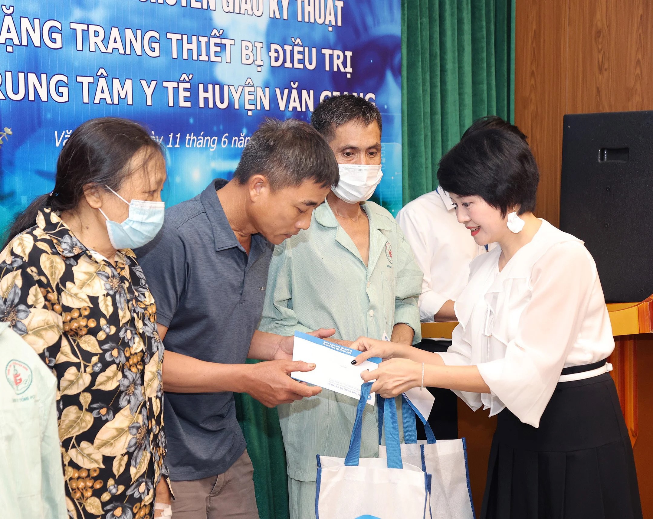 Thứ trưởng Bộ Y tế Trần Văn Thuấn, Phó Chủ tịch UBND tỉnh Hưng Yên Nguyễn Duy Hưng, Phó Chủ tịch Hội Thầy thuốc trẻ Việt Nam Trần Xuân Bách, Phó Tổng Biên tập Báo Sức khỏe và Đời sống Trần Yến Châu và Giám đốc Sở Y tế Hưng Yên Nguyễn Thị Anh trao 20 phần quà cho các bệnh nhân nghèo đang điều trị tại TTYT Văn Giang.