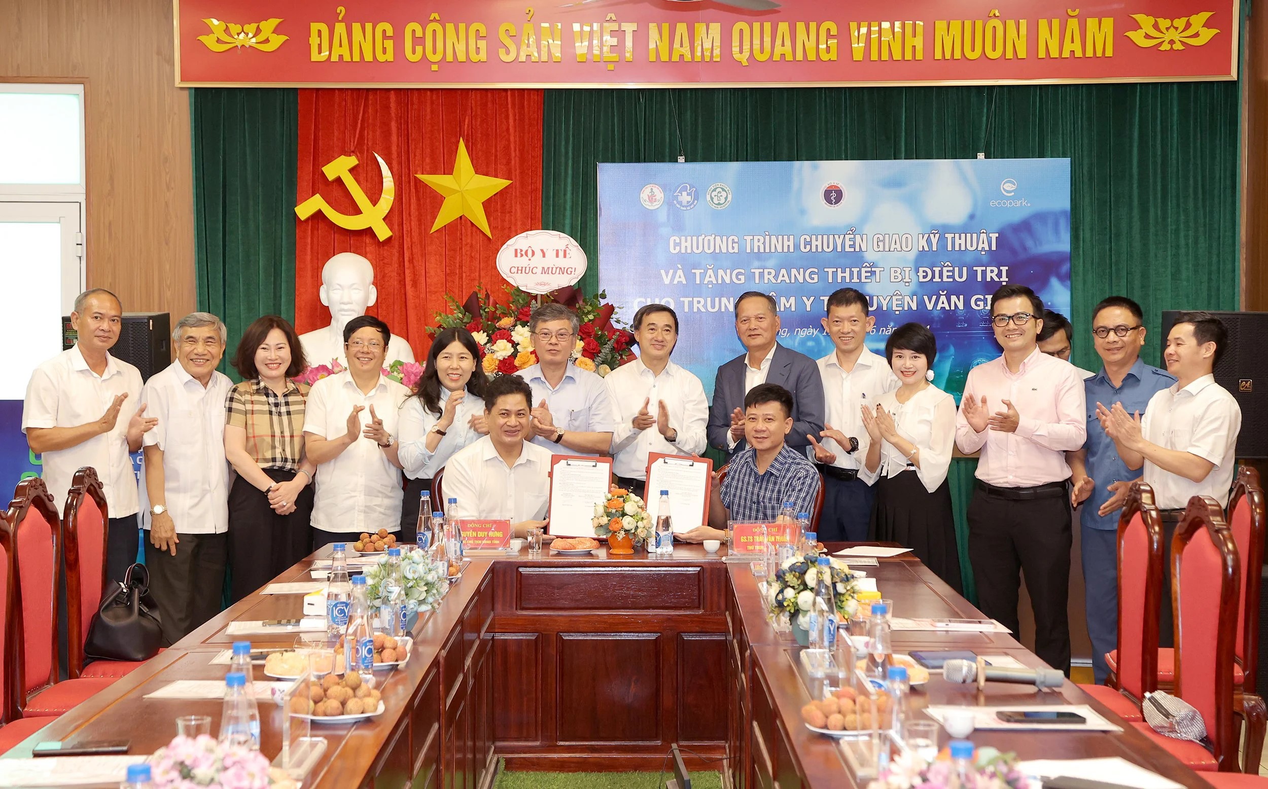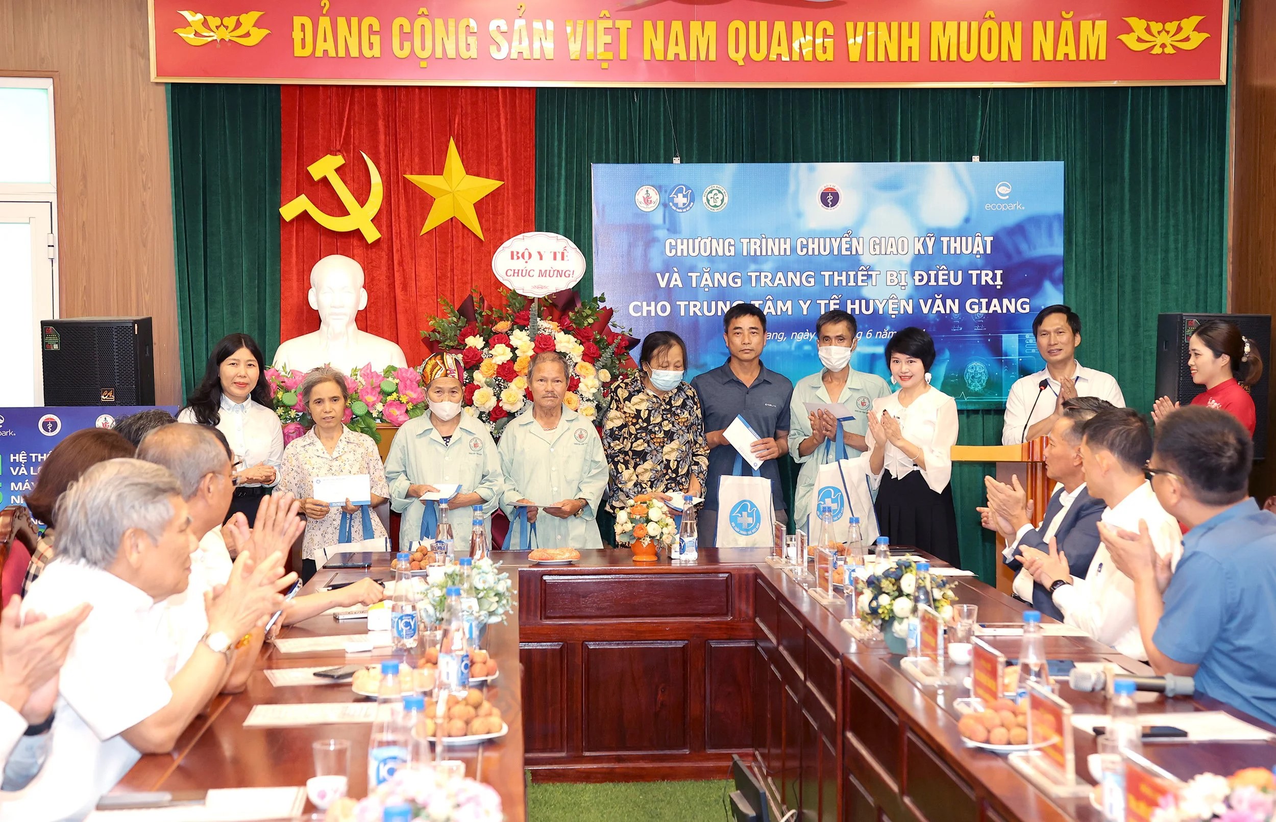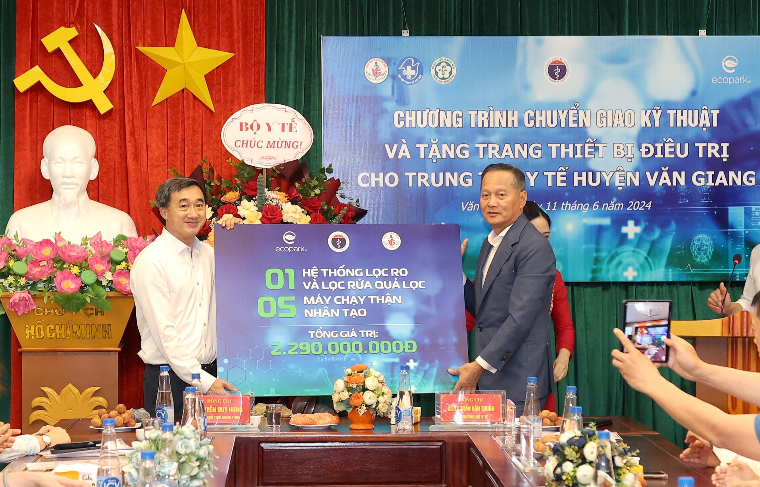 Tại chương trình, Thứ trưởng Bộ Y tế trân trọng cảm ơn Tập đoàn Ecopark đã trao tặng 1 hệ thống lọc RO và lọc rửa quả lọc; 5 máy chạy thận nhân tạo trị giá hơn 2,2 tỷ đồng cho TTYT huyện Văn Giang; đồng thời nhấn mạnh cùng với y tế công, để nâng cao chất lượng chăm sóc sức khỏe nhân dân hơn nữa, rất cần có sự vào cuộc, góp sức ngày càng nhiều hơn của y tế ngoài công lập.