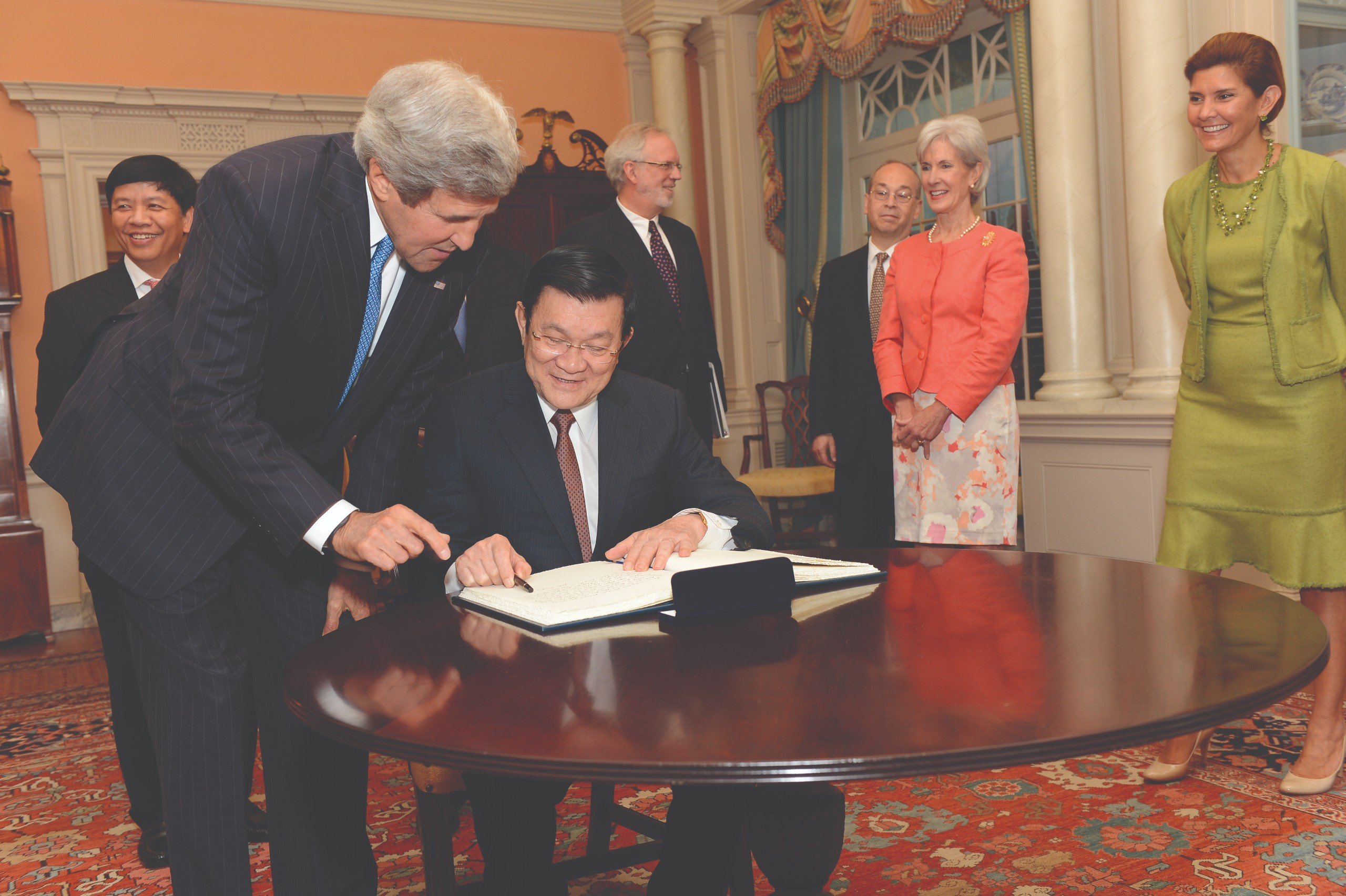 Chủ tịch nước Trương Tấn Sang ký sổ lưu niệm trong chuyến thăm Mỹ năm 2013 - Ảnh: Bộ Ngoại giao Mỹ