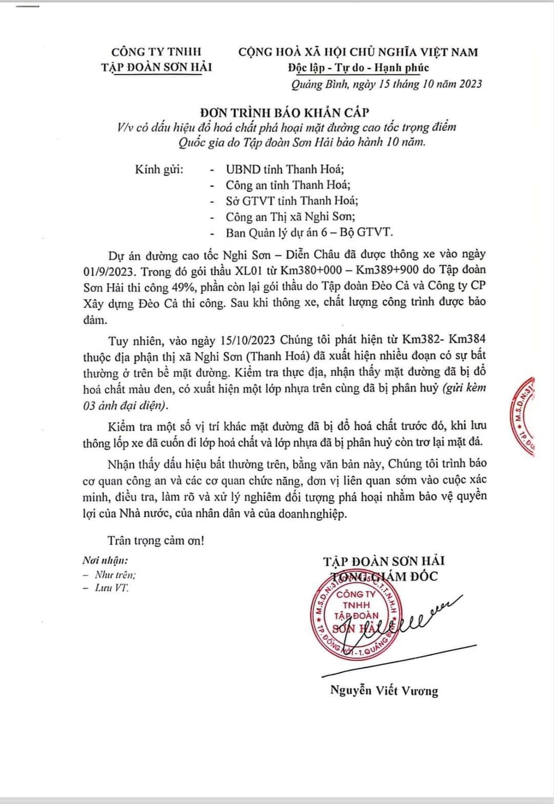 Ngày 15/10, Tập đoàn Sơn Hải đã có đơn trình báo khẩn cấp gửi Uỷ ban Nhân dân tỉnh Thanh Hoá, Công an tỉnh Thanh Hoá và các cơ quan chức năng về việc có dấu hiệu đổ hoá chất phá hoại mặt đường cao tốc trọng điểm Quốc gia do Tập đoàn Sơn Hải bảo hành 10 năm.