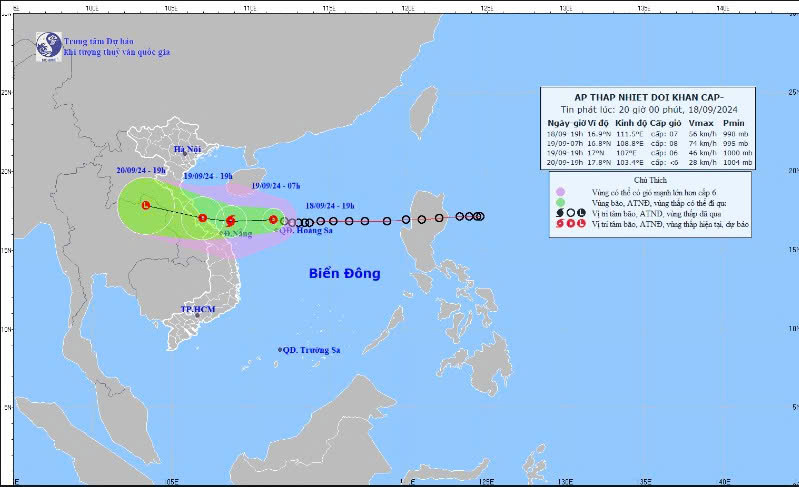 Theo dự báo của Trung tâm dự báo khí tượng thủy văn quốc gia, áp thấp nhiệt đới có khả năng mạnh lên thành bão trong đêm ngày 18 tháng 9. Từ sáng sớm ngày mai (ngày 19 tháng 9 năm 2024), bão có thể gây gió mạnh, sóng lớn ven biển và đất liền từ Hà Tĩnh đến Quảng Nam với sức gió mạnh dần lên cấp 6-7, vùng gần tâm bão đi qua cấp 8, giật cấp 10 (89-102 km/h); gây mưa lớn tại khu vực từ Thanh Hóa đến Bình Định trước, trong và sau bão. Diễn biến của áp thấp nhiệt đới, bão, mưa lũ còn rất phức tạp (dự báo có thể thay đổi cả về cấp độ gió, tốc độ di chuyển, hướng di chuyển, phạm vi ảnh hưởng và lượng mưa).