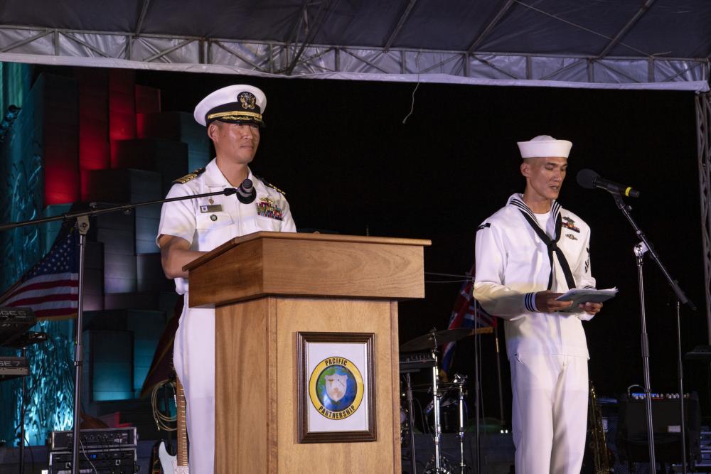 Đại úy Hank Kim, chỉ huy trưởng phái bộ Pacific Partnership 2022 (L) phát biểu trong lễ khai mạc Pacific Partnership Việt Nam 2022