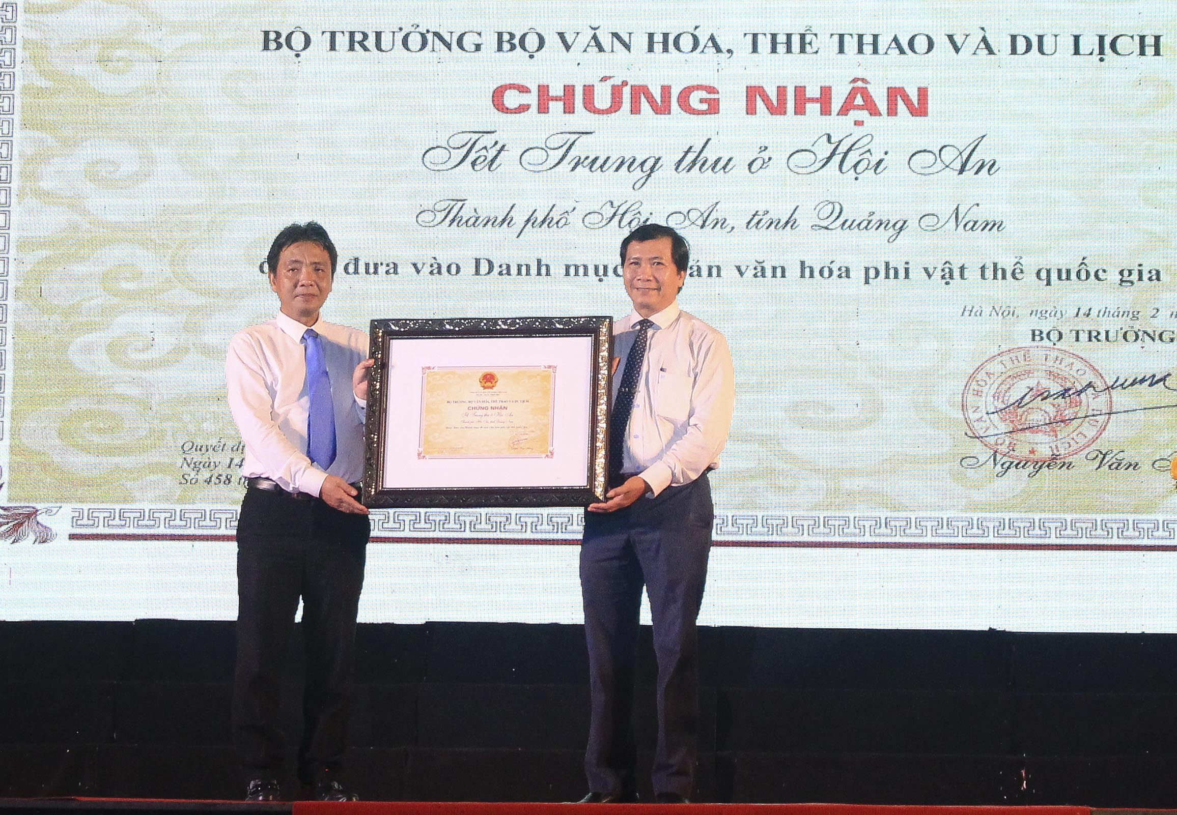 Ông Hoàng Đạo Cương (trái), Thứ trưởng Bộ VHTTDL trao chứng nhận Di sản văn hóa phi vật thể quốc gia “Lễ hội truyền thống, Tập quán xã hội và tín ngưỡng Tết Trung thu ở Hội An, Quảng Nam” cho đại diện lãnh đạo TP Hội An.