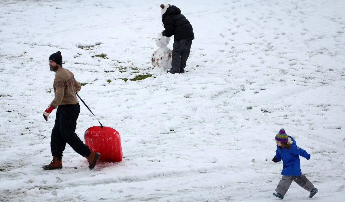 Người dân chơi đùa trong trận tuyết đầu mùaở Công viên tưởng niệm bên bờ sông Hudson, New York. Ảnh: Reuters