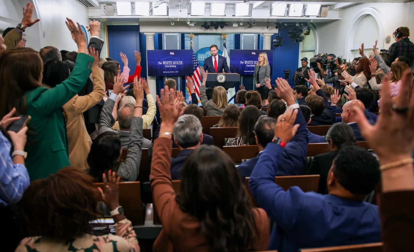 Phó Tổng thống JD Vance trả lời các câu hỏi trong buổi họp báo hôm thứ Tư. (Ảnh: Samuel Corum/Sipa/Bloomberg/Getty Images)